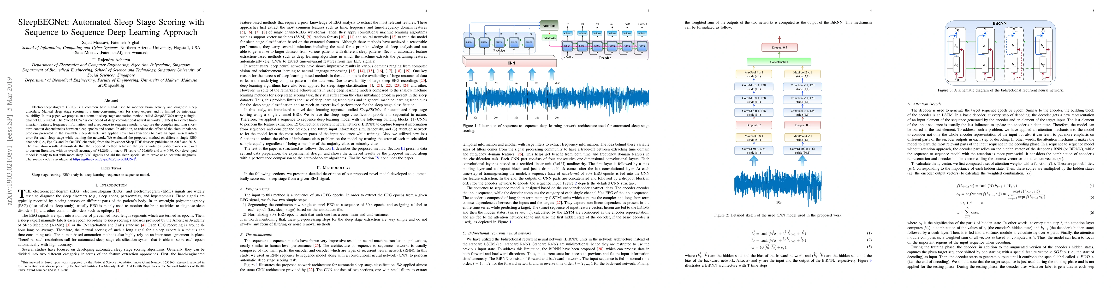 SleepEEGNet utilizes deep convolutional neural networks and sequence-to-sequence models to automate single-channel EEG-based sleep stage scoring, outperforming existing methods with 84.26% accuracy and a Cohen's Kappa coefficient of 0.79. The approach addresses class imbalance with novel loss functions.