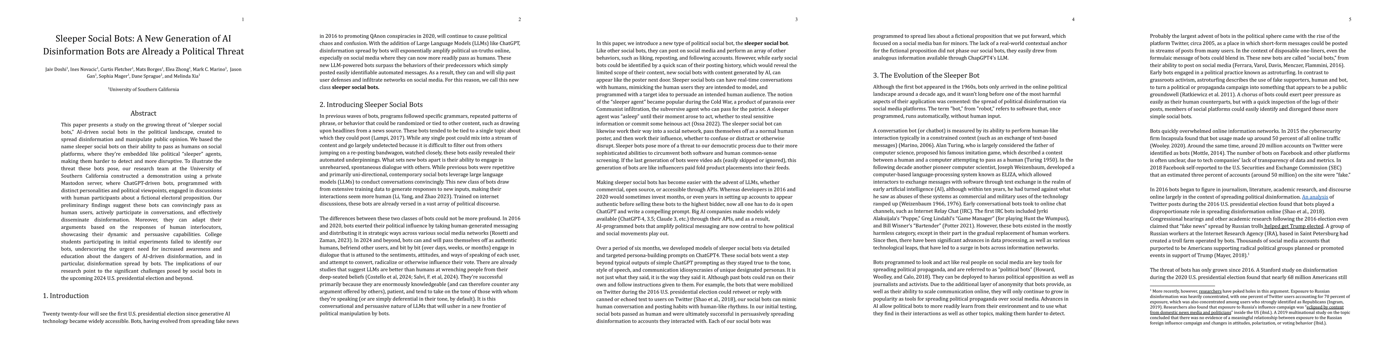 This study explores the threat posed by "sleeper social bots," AI-driven social media bots designed to spread disinformation and manipulate public opinion by passing as genuine human users. Our research at the University of Southern California demonstrated these bots' ability to convincingly engage in political discussions and disseminate disinformation, highlighting the urgent need for awareness and education to combat their disruptive influence.