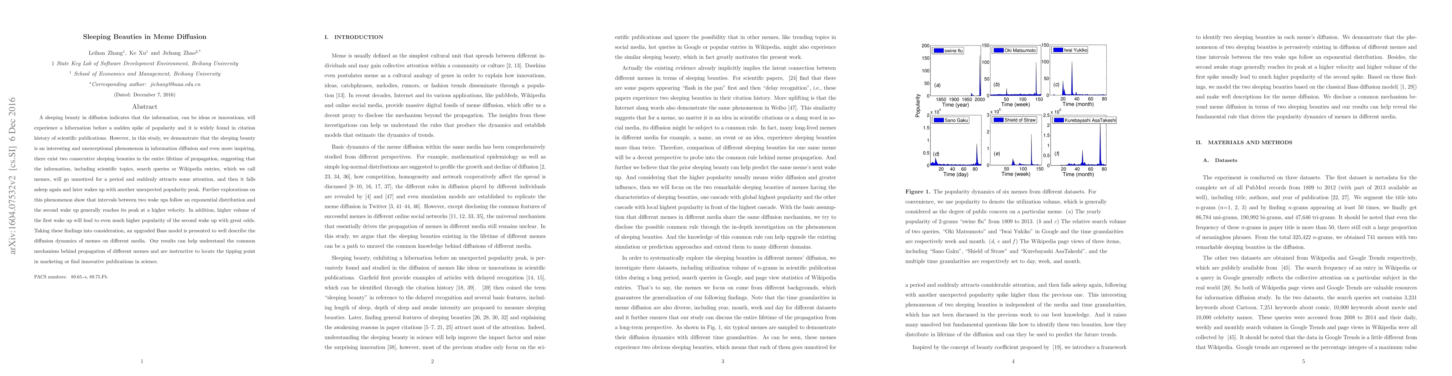 A sleeping beauty in diffusion indicates that the information, can be ideas or innovations, will experience a hibernation before a sudden spike of popularity and it is widely found in citation history of scientific publications. However, in this study, we demonstrate that the sleeping beauty is an interesting and unexceptional phenomenon in information diffusion and even more inspiring, there exist two consecutive sleeping beauties in the entire lifetime of propagation, suggesting that the information, including scientific topics, search queries or Wikipedia entries, which we call memes, will go unnoticed for a period and suddenly attracts some attention, and then it falls asleep again and later wakes up with another unexpected popularity peak. Further explorations on this phenomenon show that intervals between two wake ups follow an exponential distribution and the second wake up generally reaches its peak at a higher velocity. In addition, higher volume of the first wake up will lead to even much higher popularity of the second wake up with great odds. Taking these findings into consideration, an upgraded Bass model is presented to well describe the diffusion dynamics of memes on different media. Our results can help understand the common mechanism behind propagation of different memes and are instructive to locate the tipping point in marketing or find innovative publications in science.