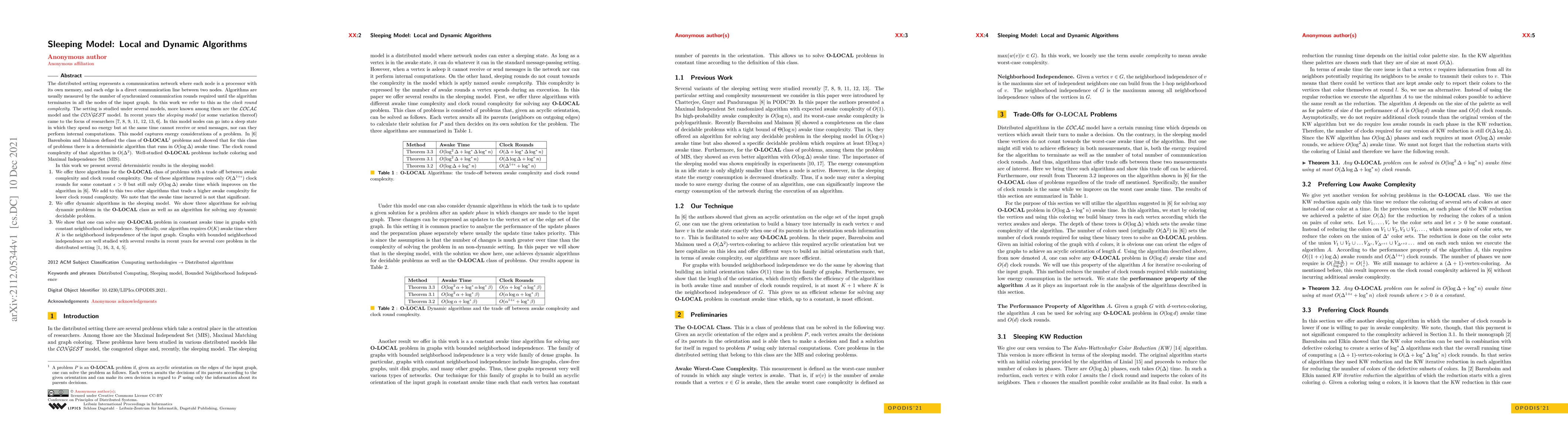 In recent years the sleeping model came to the focus of researchers. In this model nodes can go into a sleep state in which they spend no energy but at the same time cannot receive or send messages, nor can they perform internal computations. This model captures energy considerations of a problem. A problem P is an O-LOCAL problem if, given an acyclic orientation on the edges of the input graph, one can solve the problem as follows. Each vertex awaits the decisions of its parents according to the given orientation and can make its own decision in regard to P using only the information about its parents decisions. problems and showed that for this class of problems there is a deterministic algorithm that runs in $O(\log \Delta)$ awake time. The clock round complexity of that algorithm is $O(\Delta^2)$. In this work we offer three algorithms for the bf O-LOCAL class of problems with a trade off between awake complexity and clock round complexity. One of these algorithms requires only $O(\Delta^{1+\epsilon})$ clock rounds for some constant $\epsilon>0$ but still only $O(\log \Delta)$ awake time which improves on the algorithm in \cite{BM21}. We add to this two other algorithms that trade a higher awake complexity for lower clock round complexity. We note that the awake time incurred is not that significant. We offer dynamic algorithms in the sleeping model. We show three algorithms for solving dynamic problems in the O-LOCAL class as well as an algorithm for solving any dynamic decidable problem. We show that one can solve any {\bf O-LOCAL} problem in constant awake time in graphs with constant neighborhood independence. Specifically, our algorithm requires $O(K)$ awake time where $K$ is the neighborhood independence of the input graph. Graphs with bounded neighborhood independence are well studied with several results in recent years for several core problem in the distributed setting.