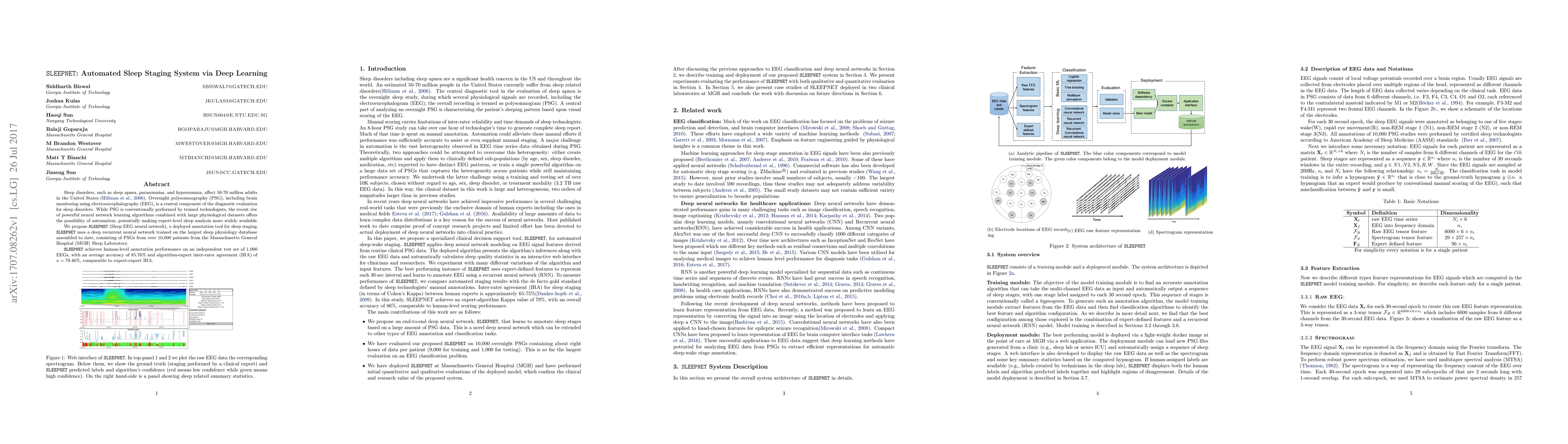 Sleep disorders, such as sleep apnea, parasomnias, and hypersomnia, affect 50-70 million adults in the United States (Hillman et al., 2006). Overnight polysomnography (PSG), including brain monitoring using electroencephalography (EEG), is a central component of the diagnostic evaluation for sleep disorders. While PSG is conventionally performed by trained technologists, the recent rise of powerful neural network learning algorithms combined with large physiological datasets offers the possibility of automation, potentially making expert-level sleep analysis more widely available. We propose SLEEPNET (Sleep EEG neural network), a deployed annotation tool for sleep staging. SLEEPNET uses a deep recurrent neural network trained on the largest sleep physiology database assembled to date, consisting of PSGs from over 10,000 patients from the Massachusetts General Hospital (MGH) Sleep Laboratory. SLEEPNET achieves human-level annotation performance on an independent test set of 1,000 EEGs, with an average accuracy of 85.76% and algorithm-expert inter-rater agreement (IRA) of kappa = 79.46%, comparable to expert-expert IRA.