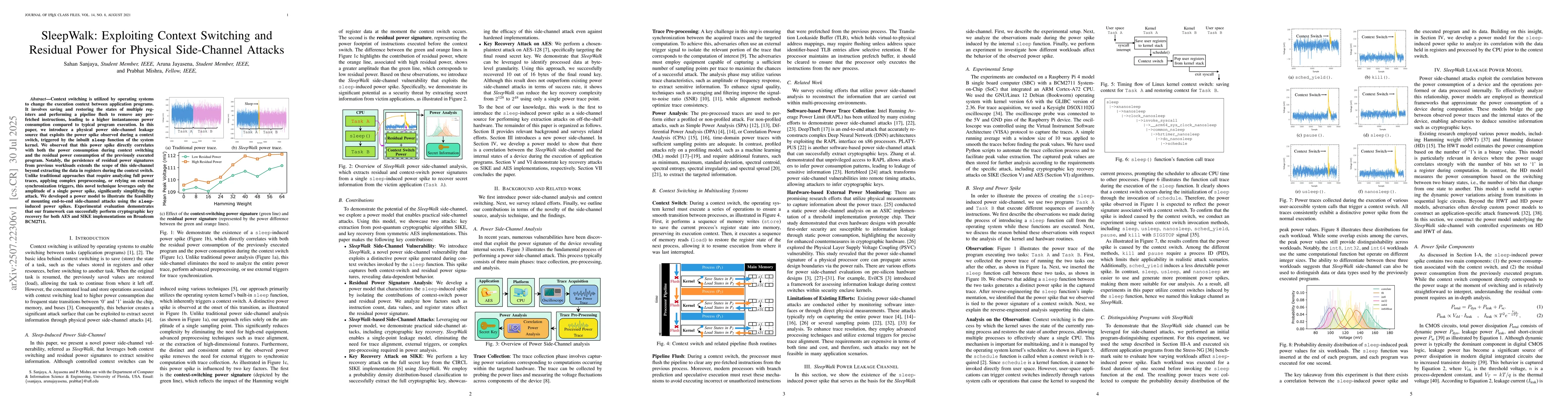 The research introduces SleepWalk, a novel power side-channel vulnerability exploiting sleep-induced power spikes for cryptographic key recovery on off-the-shelf hardware. It establishes a power model for sleep-induced spikes, correlating them with data in registers and processed data before context switching.