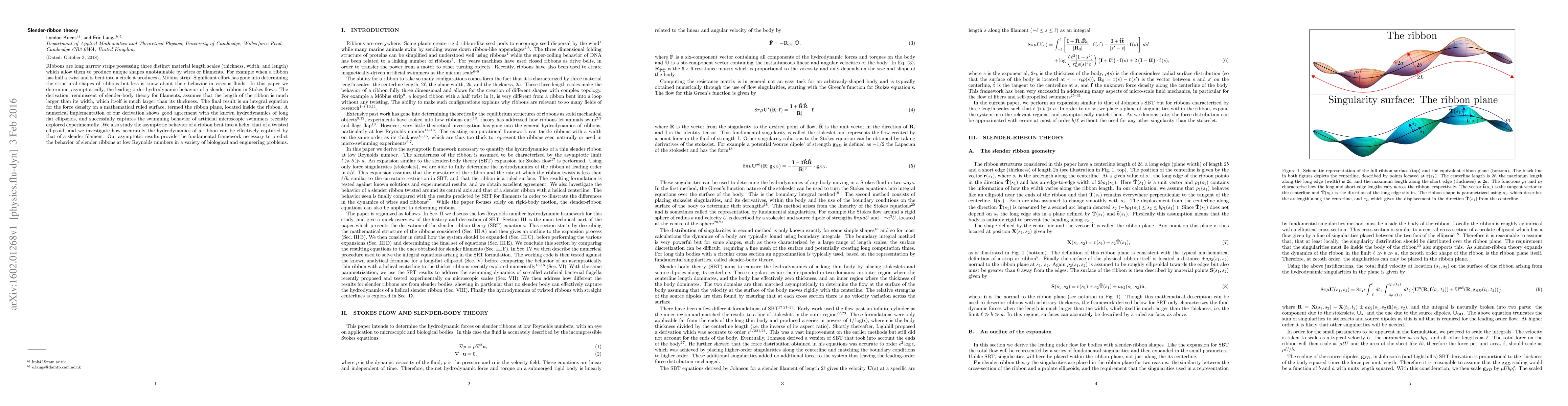 Ribbons are long narrow strips possessing three distinct material length scales (thickness, width, and length) which allow them to produce unique shapes unobtainable by wires or filaments. For example when a ribbon has half a twist and is bent into a circle it produces a M\"obius strip. Significant effort has gone into determining the structural shapes of ribbons but less is know about their behavior in viscous fluids. In this paper we determine, asymptotically, the leading-order hydrodynamic behavior of a slender ribbon in Stokes flows. The derivation, reminiscent of slender-body theory for filaments, assumes that the length of the ribbon is much larger than its width, which itself is much larger than its thickness. The final result is an integral equation for the force density on a mathematical ruled surface, termed the ribbon plane, located inside the ribbon. A numerical implementation of our derivation shows good agreement with the known hydrodynamics of long flat ellipsoids, and successfully captures the swimming behavior of artificial microscopic swimmers recently explored experimentally. We also study the asymptotic behavior of a ribbon bent into a helix, that of a twisted ellipsoid, and we investigate how accurately the hydrodynamics of a ribbon can be effectively captured by that of a slender filament. Our asymptotic results provide the fundamental framework necessary to predict the behavior of slender ribbons at low Reynolds numbers in a variety of biological and engineering problems.