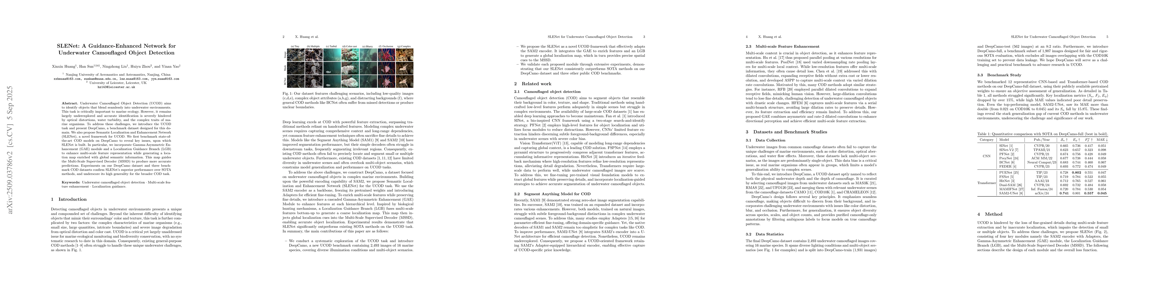 Underwater Camouflaged Object Detection (UCOD) aims to identify objects that blend seamlessly into underwater environments. This task is critically important to marine ecology. However, it remains largely underexplored and accurate identification is severely hindered by optical distortions, water turbidity, and the complex traits of marine organisms. To address these challenges, we introduce the UCOD task and present DeepCamo, a benchmark dataset designed for this domain. We also propose Semantic Localization and Enhancement Network (SLENet), a novel framework for UCOD. We first benchmark state-of-the-art COD models on DeepCamo to reveal key issues, upon which SLENet is built. In particular, we incorporate Gamma-Asymmetric Enhancement (GAE) module and a Localization Guidance Branch (LGB) to enhance multi-scale feature representation while generating a location map enriched with global semantic information. This map guides the Multi-Scale Supervised Decoder (MSSD) to produce more accurate predictions. Experiments on our DeepCamo dataset and three benchmark COD datasets confirm SLENet's superior performance over SOTA methods, and underscore its high generality for the broader COD task.