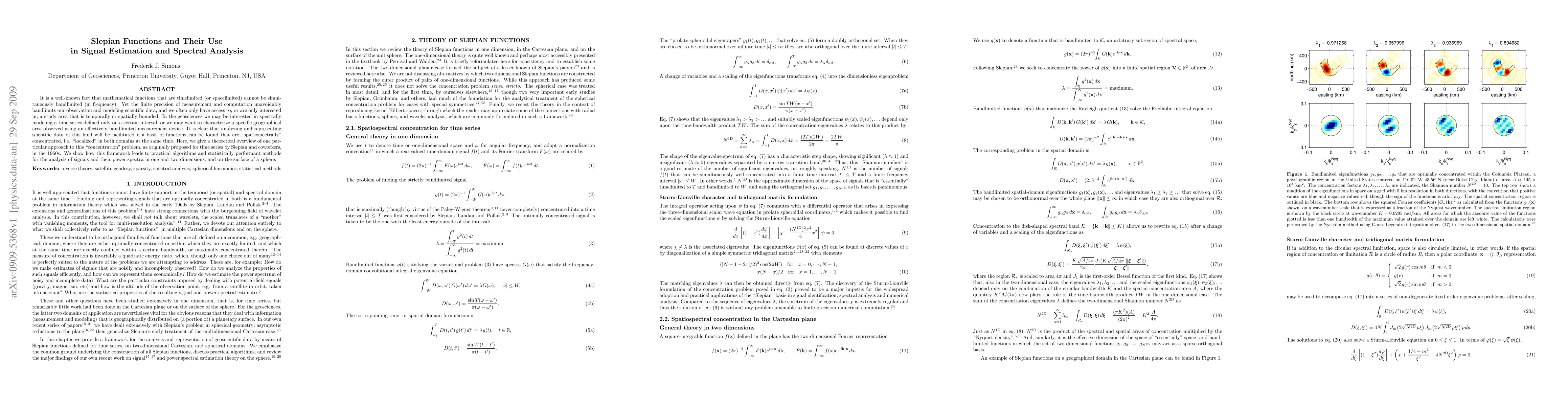 This paper provides a theoretical overview of Slepian functions, which are used to address the challenge of simultaneously localizing functions in both time/space and frequency domains. It outlines practical algorithms and methods derived from this framework for signal estimation and spectral analysis in geosciences.