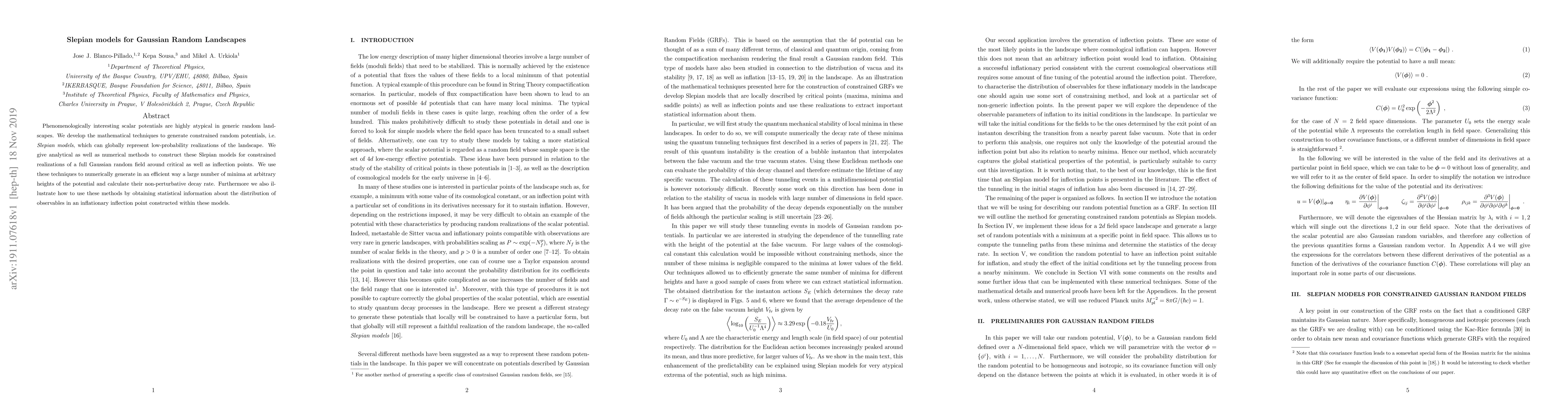 Phenomenologically interesting scalar potentials are highly atypical in generic random landscapes. We develop the mathematical techniques to generate constrained random potentials, i.e. Slepian models, which can globally represent low-probability realizations of the landscape. We give analytical as well as numerical methods to construct these Slepian models for constrained realizations of a full Gaussian random field around critical as well as inflection points. We use these techniques to numerically generate in an efficient way a large number of minima at arbitrary heights of the potential and calculate their non-perturbative decay rate. Furthermore, we also illustrate how to use these methods by obtaining statistical information about the distribution of observables in an inflationary inflection point constructed within these models.