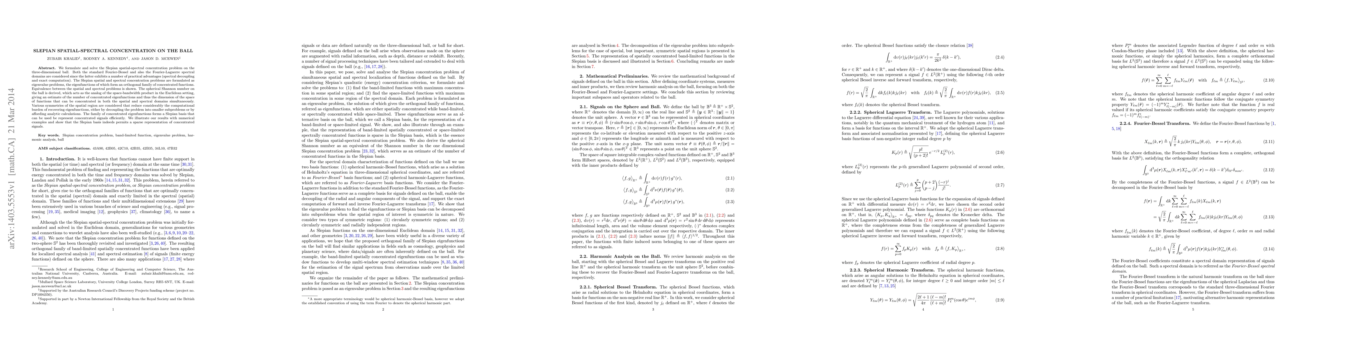 We formulate and solve the Slepian spatial-spectral concentration problem on the three-dimensional ball. Both the standard Fourier-Bessel and also the Fourier-Laguerre spectral domains are considered since the latter exhibits a number of practical advantages (spectral decoupling and exact computation). The Slepian spatial and spectral concentration problems are formulated as eigenvalue problems, the eigenfunctions of which form an orthogonal family of concentrated functions. Equivalence between the spatial and spectral problems is shown. The spherical Shannon number on the ball is derived, which acts as the analog of the space-bandwidth product in the Euclidean setting, giving an estimate of the number of concentrated eigenfunctions and thus the dimension of the space of functions that can be concentrated in both the spatial and spectral domains simultaneously. Various symmetries of the spatial region are considered that reduce considerably the computational burden of recovering eigenfunctions, either by decoupling the problem into smaller subproblems or by affording analytic calculations. The family of concentrated eigenfunctions forms a Slepian basis that can be used be represent concentrated signals efficiently. We illustrate our results with numerical examples and show that the Slepian basis indeeds permits a sparse representation of concentrated signals.