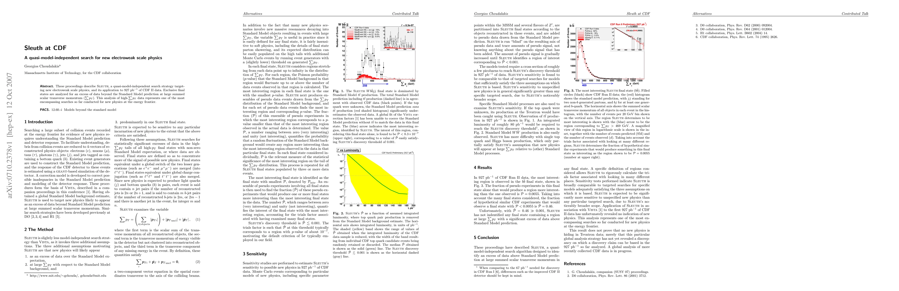 Summary: The Sleuth search strategy employs a quasi-model-independent approach to investigate new electroweak scale physics using CDF II data, analyzing high-pT final states for deviations from Standard Model predictions. This comprehensive analysis of large summed scalar transverse momentum represents a significant effort in the search for new physics.