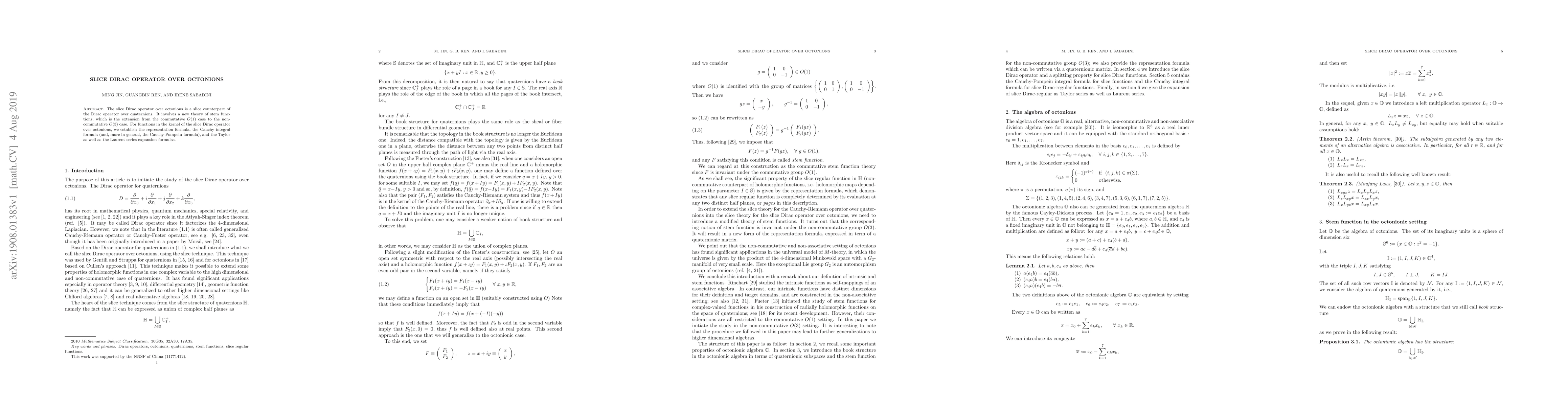 The slice Dirac operator over octonions extends the Dirac operator from quaternions to octonions, introducing a new theory of stem functions. Functions in its kernel are characterized by representation, integral, and series expansion formulas.