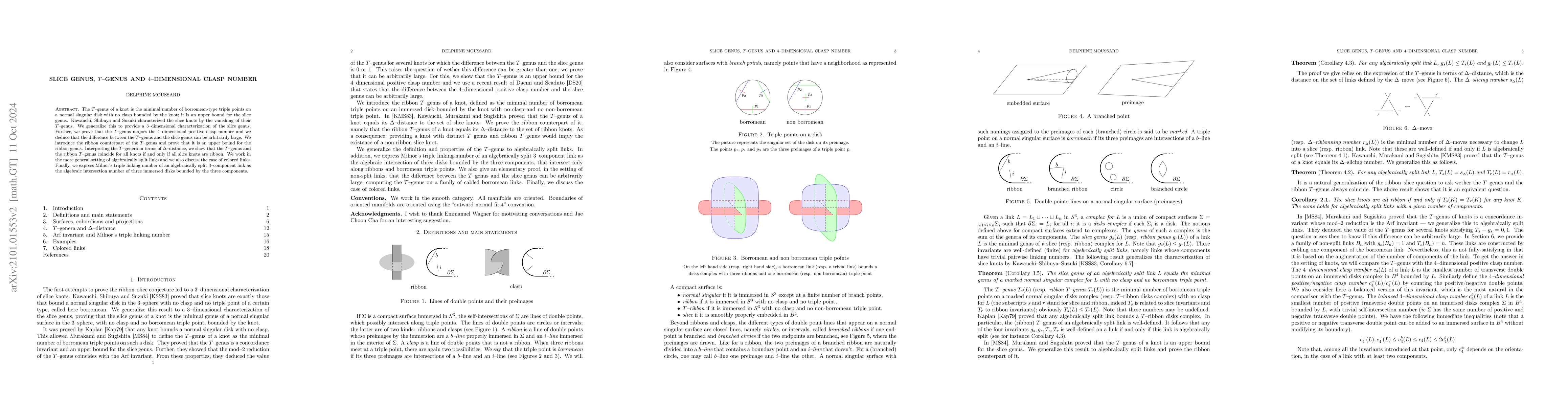 The $T$-genus of a knot is the minimal number of borromean-type triple points on a normal singular disk with no clasp bounded by the knot; it is an upper bound for the slice genus. Kawauchi, Shibuya and Suzuki characterized the slice knots by the vanishing of their $T$-genus. We generalize this to provide a $3$-dimensional characterization of the slice genus. Further, we prove that the $T$-genus majors the $4$-dimensional positive clasp number and we deduce that the difference between the $T$-genus and the slice genus can be arbitrarily large. We introduce the ribbon counterpart of the $T$-genus and prove that it is an upper bound for the ribbon genus. Interpreting the $T$-genera in terms of $\Delta$-distance, we show that the $T$-genus and the ribbon $T$-genus coincide for all knots if and only if all slice knots are ribbon. We work in the more general setting of algebraically split links and we also discuss the case of colored links. Finally, we express Milnor's triple linking number of an algebraically split $3$-component link as the algebraic intersection number of three immersed disks bounded by the three components.