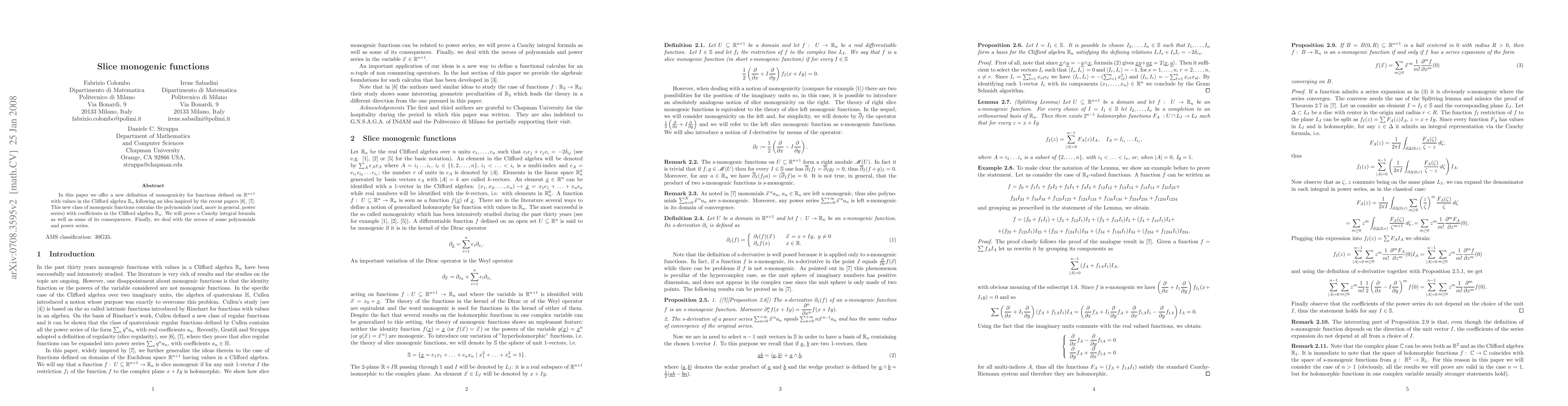 In this paper we offer a definition of monogenicity for functions defined on $\rr^{n+1}$ with values in the Clifford algebra $\rr_n$ following an idea inspired by the recent papers \cite{gs}, \cite{advances}. This new class of monogenic functions contains the polynomials (and, more in general, power series) with coefficients in the Clifford algebra $\rr_n$. We will prove a Cauchy integral formula as well as some of its consequences. Finally, we deal with the zeroes of some polynomials and power series.