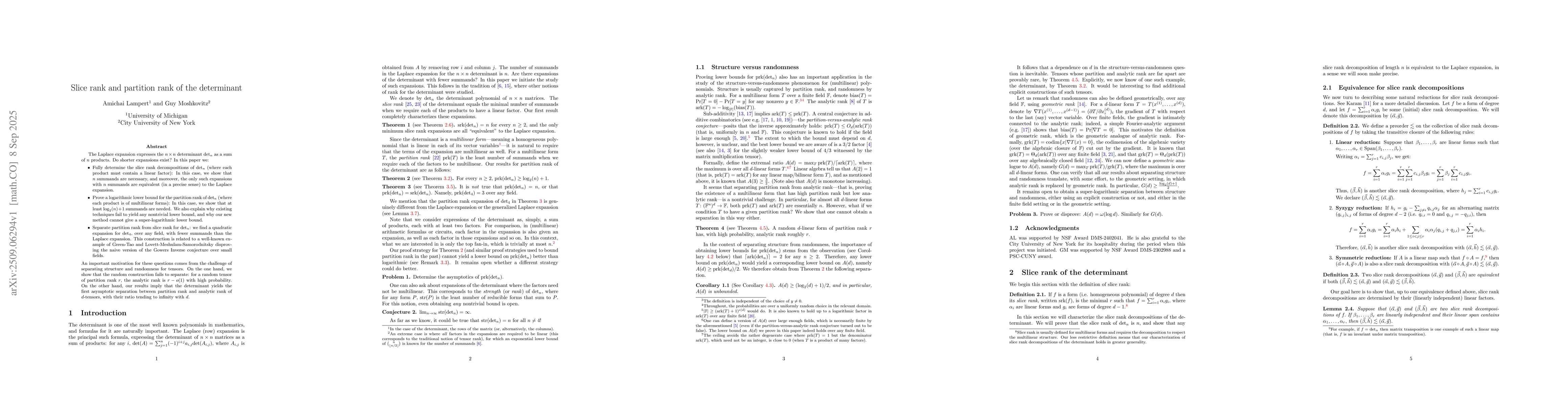 The Laplace expansion expresses the $n \times n$ determinant $\det_n$ as a sum of $n$ products. Do shorter expansions exist? In this paper we: - Fully determine the slice rank decompositions of $\det_n$ (where each product must contain a linear factor): In this case, we show that $n$ summands are necessary, and moreover, the only such expansions with $n$ summands are equivalent (in a precise sense) to the Laplace expansion. - Prove a logarithmic lower bound for the partition rank of $\det_n$ (where each product is of multilinear forms): In this case, we show that at least $\log_2(n)+1$ summands are needed. We also explain why existing techniques fail to yield any nontrivial lower bound, and why our new method cannot give a super-logarithmic lower bound. - Separate partition rank from slice rank for $\det_n$: we find a quadratic expansion for $\det_4$, over any field, with fewer summands than the Laplace expansion. This construction is related to a well-known example of Green-Tao and Lovett-Meshulam-Samorodnitsky disproving the naive version of the Gowers Inverse conjecture over small fields. An important motivation for these questions comes from the challenge of separating structure and randomness for tensors. On the one hand, we show that the random construction fails to separate: for a random tensor of partition rank $r$, the analytic rank is $r-o(1)$ with high probability. On the other hand, our results imply that the determinant yields the first asymptotic separation between partition rank and analytic rank of $d$-tensors, with their ratio tending to infinity with $d$.