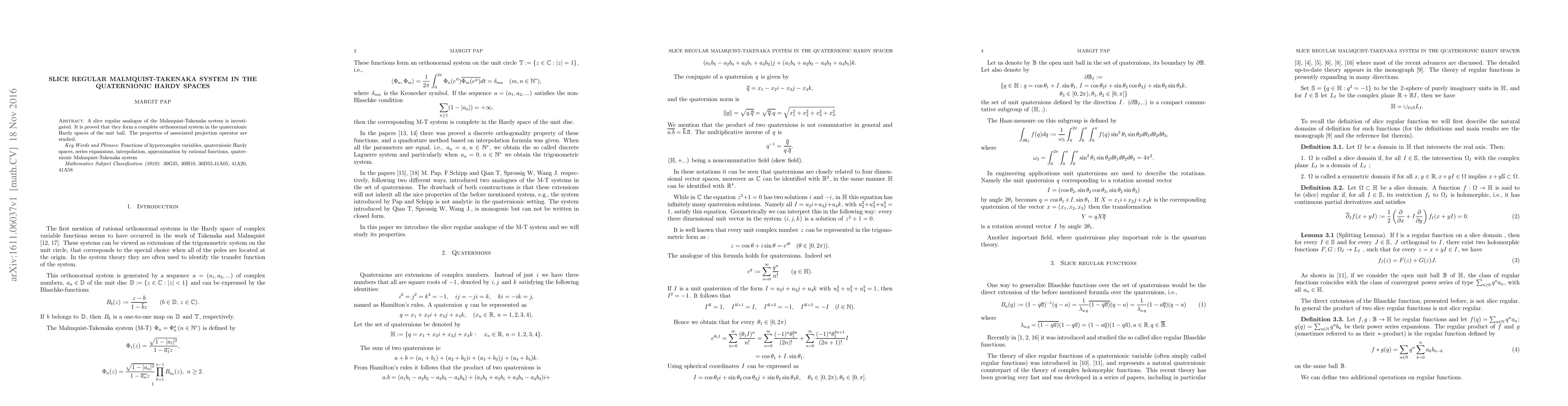 This paper studies slice regular analogues of the Malmquist-Takenaka system in quaternionic Hardy spaces, proving their completeness and orthonormality, and analyzes the properties of the associated projection operator. Keywords focus on hypercomplex functions, quaternionic spaces, and series expansions.
