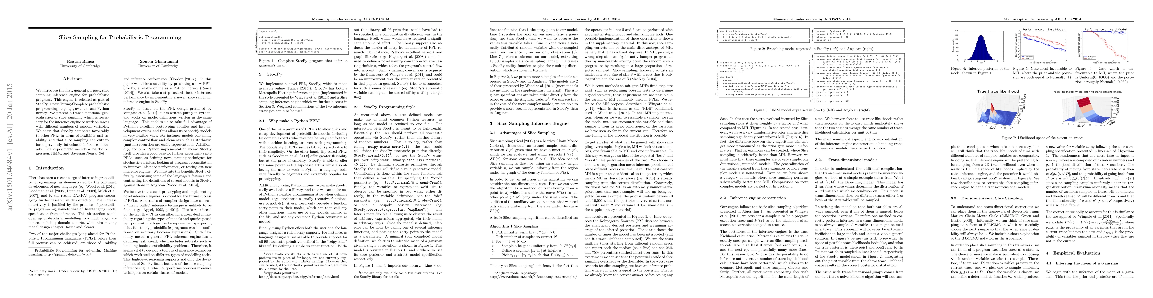 This paper introduces a general slice sampling inference engine for probabilistic programming within StocPy, a new Turing-Complete probabilistic programming language. The authors demonstrate that their method outperforms previous inference techniques and is flexible and user-friendly, as shown through experiments with logistic regression, HMM, and Bayesian Neural Net.