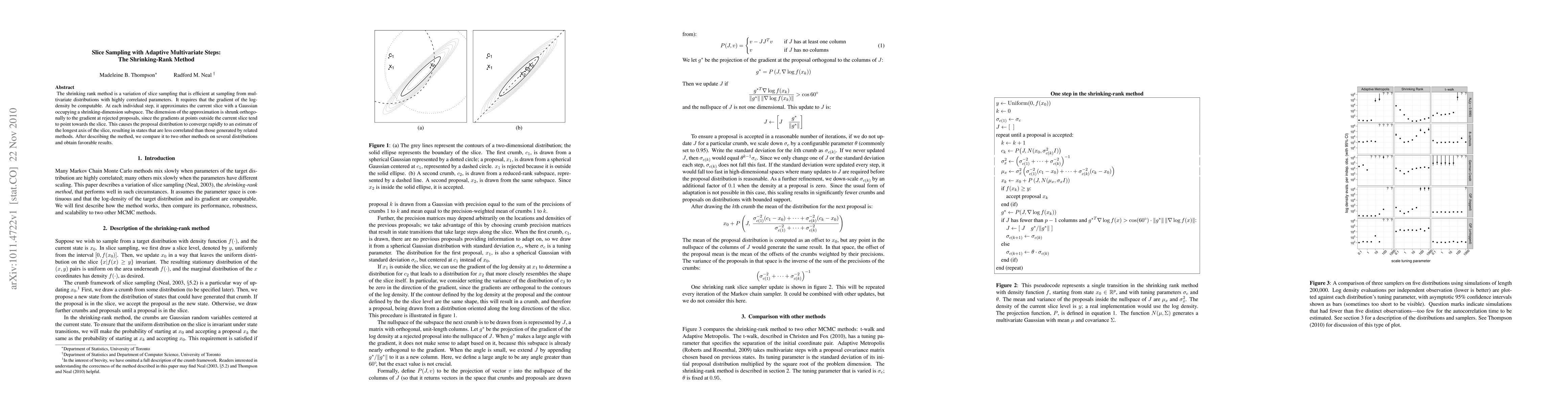 A new method called shrinking-rank slice sampling efficiently samples from multivariate distributions with highly correlated parameters by approximating the current slice with a shrinking dimension Gaussian distribution.