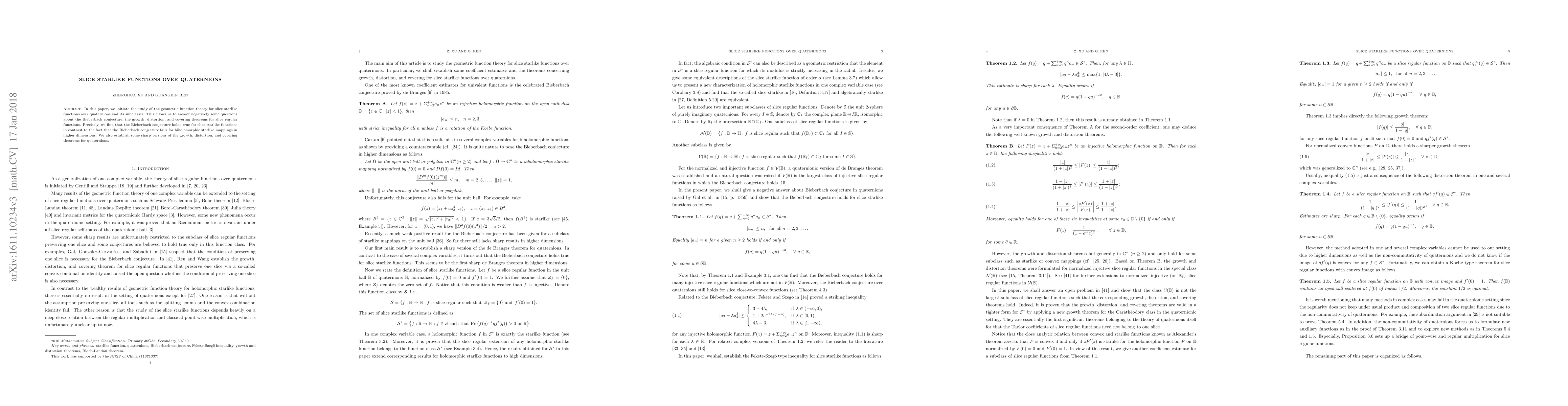 This paper explores the geometric function theory of slice starlike functions over quaternions, finding that the Bieberbach conjecture holds true for these functions, unlike biholomorphic starlike mappings in higher dimensions. It also establishes sharp versions of the growth, distortion, and covering theorems for quaternions.