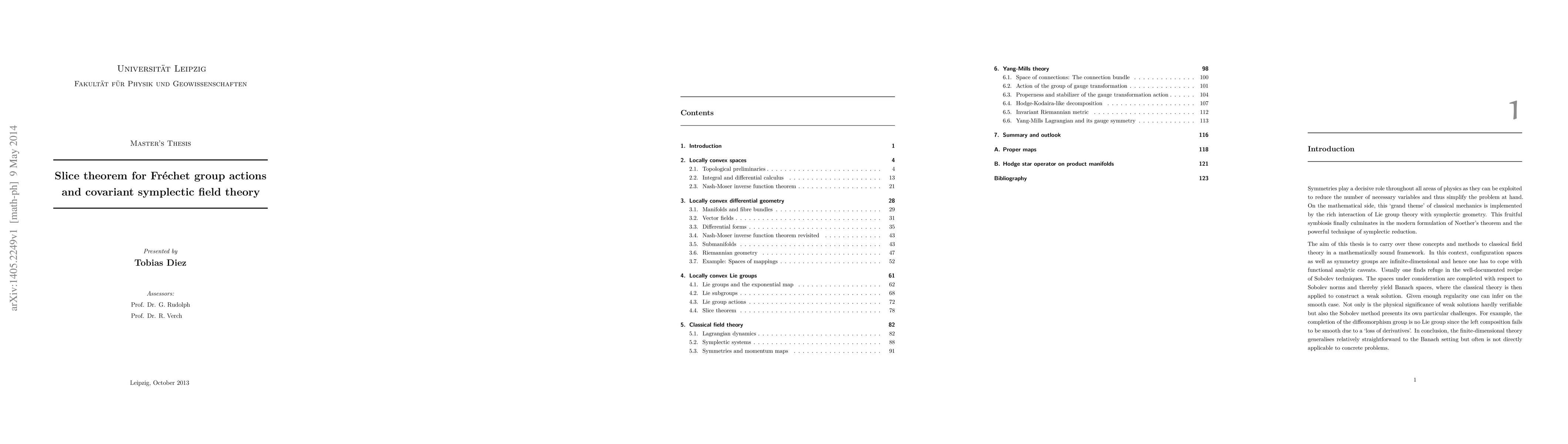 A general slice theorem for the action of a Fr\'echet Lie group on a Fr\'echet manifolds is established. The Nash-Moser theorem provides the fundamental tool to generalize the result of Palais to this infinite-dimensional setting. The presented slice theorem is illustrated by its application to gauge theories: the action of the gauge transformation group admits smooth slices at every point and thus the gauge orbit space is stratified by Fr\'echet manifolds. Furthermore, a covariant and symplectic formulation of classical field theory is proposed and extensively discussed. At the root of this novel framework is the incorporation of field degrees of freedom F and spacetime M into the product manifold F * M. The induced bigrading of differential forms is used in order to carry over the usual symplectic theory to this new setting. The examples of the Klein-Gordon field and general Yang-Mills theory illustrate that the presented approach conveniently handles the occurring symmetries.