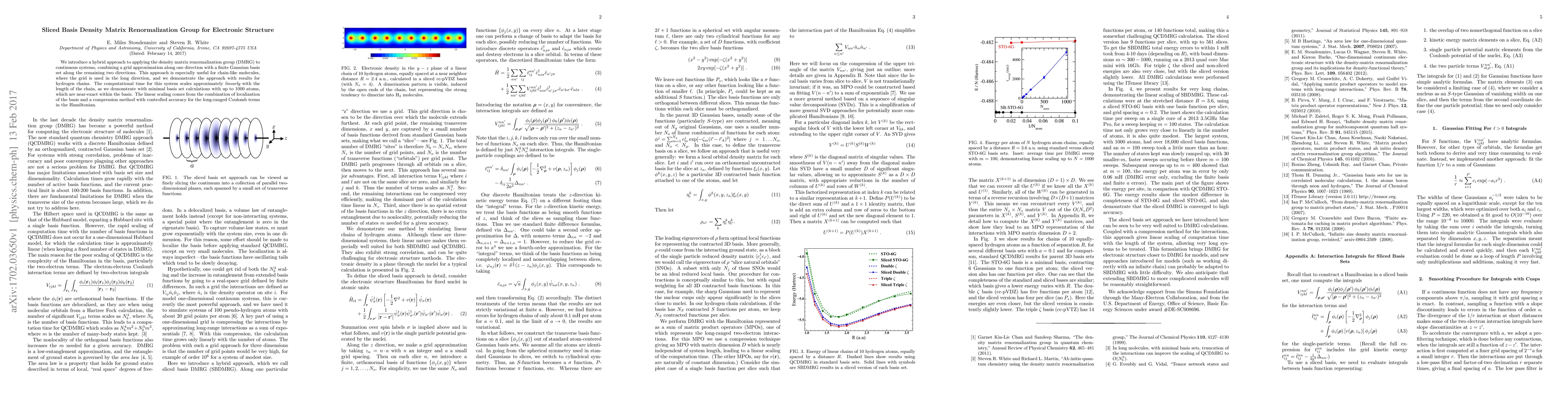 This paper presents a sliced basis DMRG method for electronic structure, combining grid approximation and Gaussian basis sets for efficient calculations on chain-like molecules. The approach demonstrates linear scaling with chain length and near-exact results for hydrogen chains up to 1000 atoms.