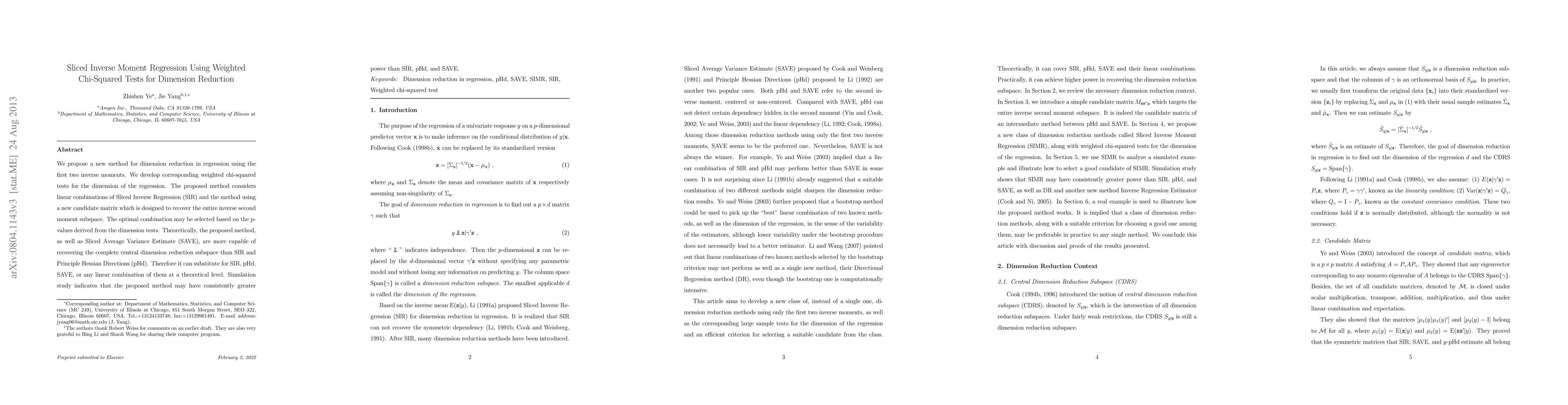 This paper introduces a novel dimension reduction method for regression that uses the first two inverse moments and weighted chi-squared tests. It combines Sliced Inverse Regression (SIR) with a new candidate matrix to recover the entire inverse second moment subspace, potentially offering superior performance over SIR, Principle Hessian Directions (pHd), and Sliced Average Variance Estimate (SAVE) in both theoretical and practical terms.