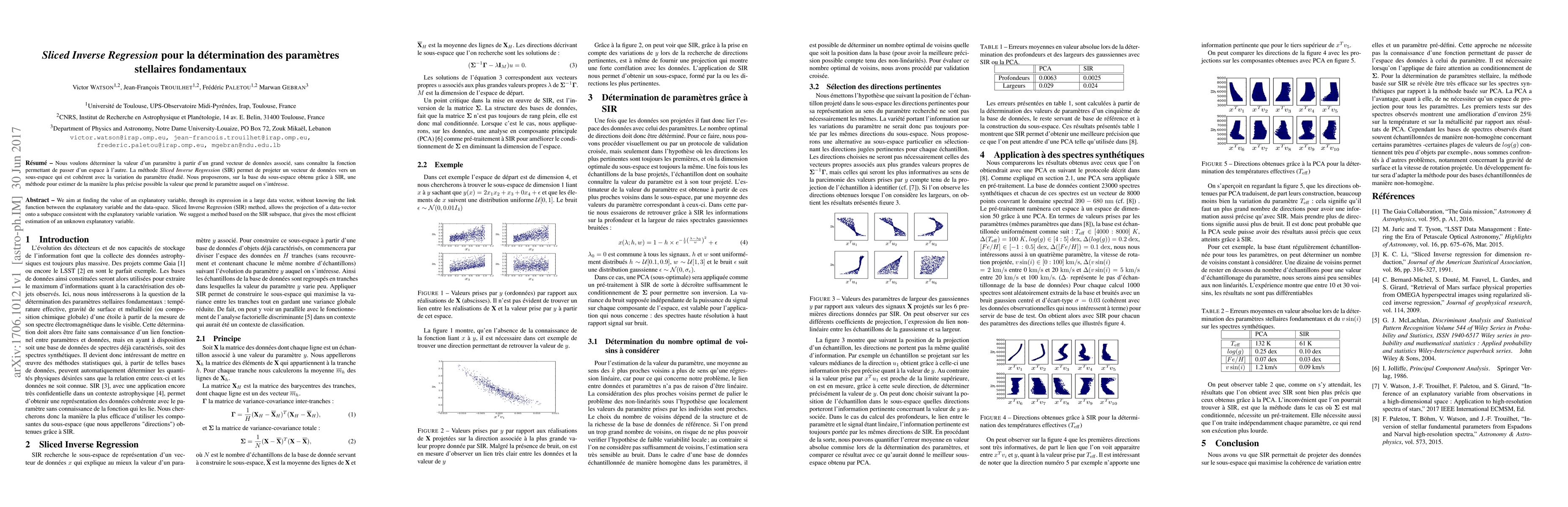 Summary: This paper proposes a Sliced Inverse Regression (SIR) method to estimate stellar fundamental parameters without knowing the underlying link function. SIR projects data onto a subspace reflecting the explanatory variable's variation, leading to efficient estimation of unknown variables.