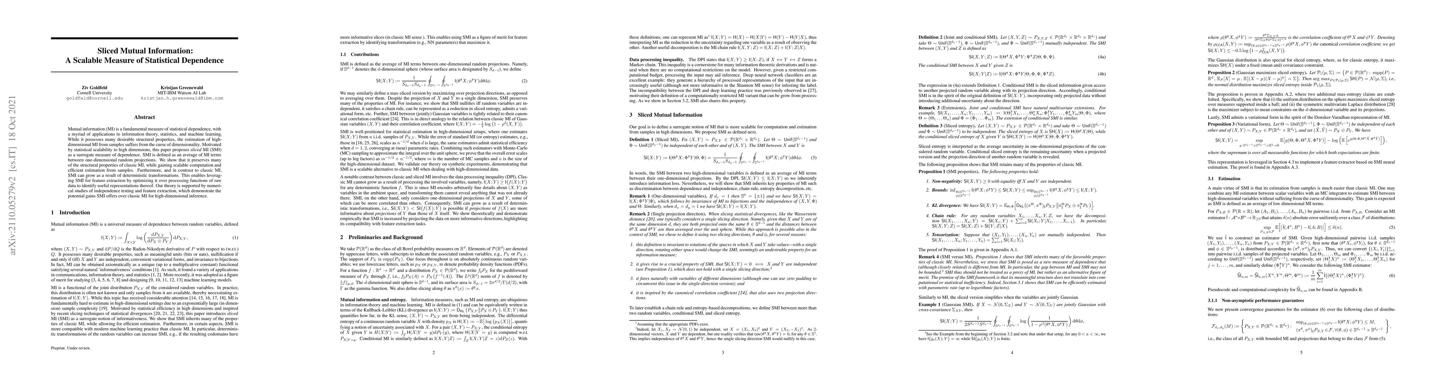This paper introduces sliced mutual information (SMI) as a scalable alternative to traditional mutual information (MI) for measuring statistical dependence in high-dimensional data. SMI averages MI across one-dimensional projections, offering scalable computation and efficient estimation while preserving many properties of classic MI.