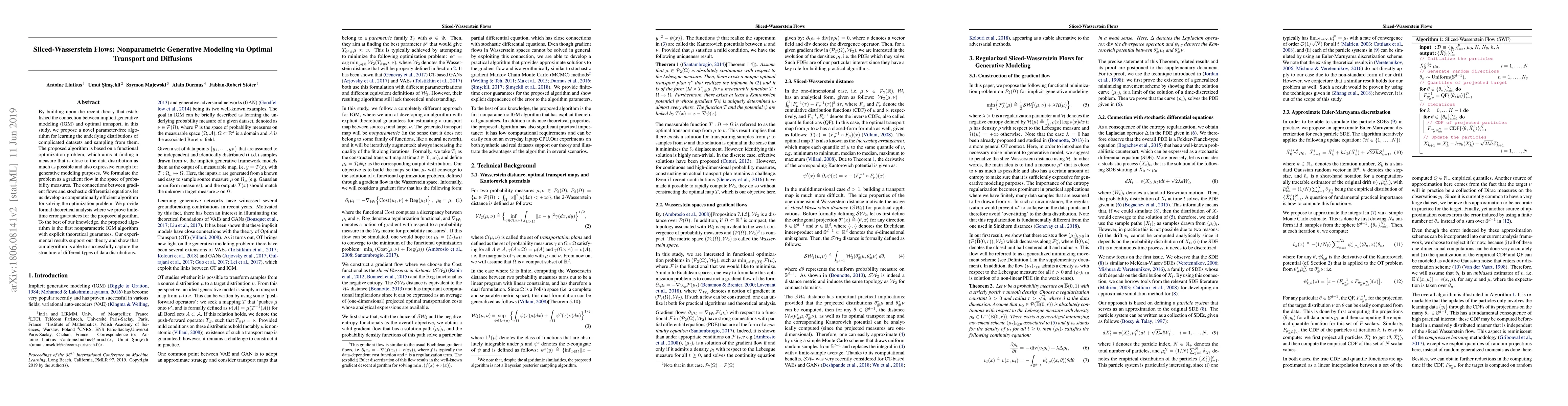This paper proposes a novel parameter-free algorithm for nonparametric generative modeling based on sliced-Wasserstein flows, leveraging optimal transport and stochastic differential equations. The algorithm provides theoretical guarantees and successfully captures the structure of complex data distributions, as demonstrated by experimental results.