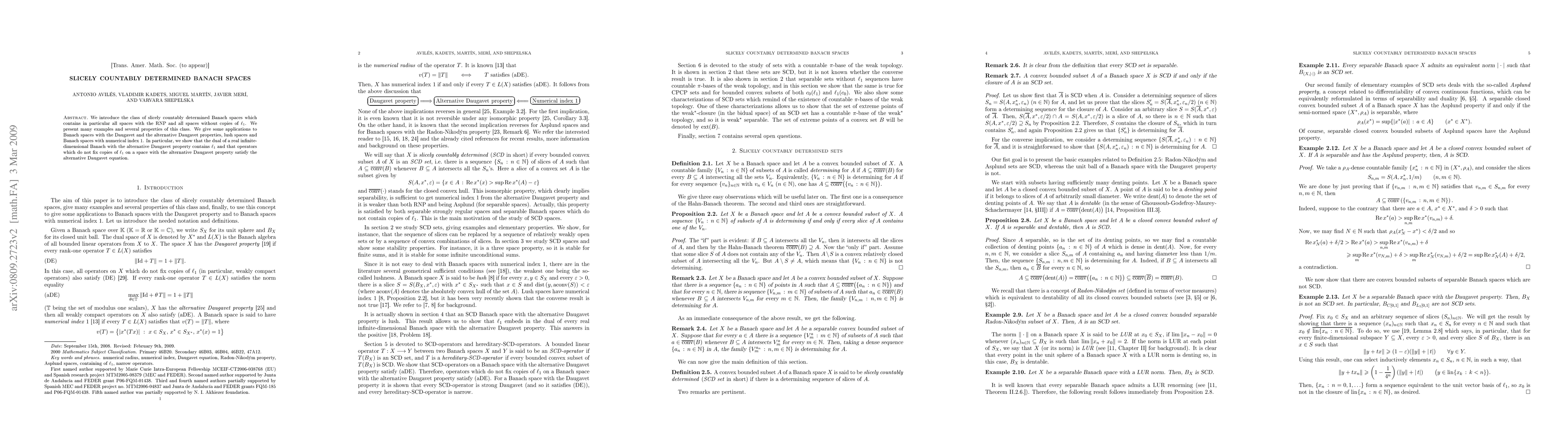 This paper explores slicely countably determined Banach spaces, encompassing spaces with the RNP and those without $\ell_1$ copies. It provides examples, properties, and applications, notably showing that duals of certain Banach spaces with the alternative Daugavet property contain $\ell_1$ and that specific operators satisfy the alternative Daugavet equation.