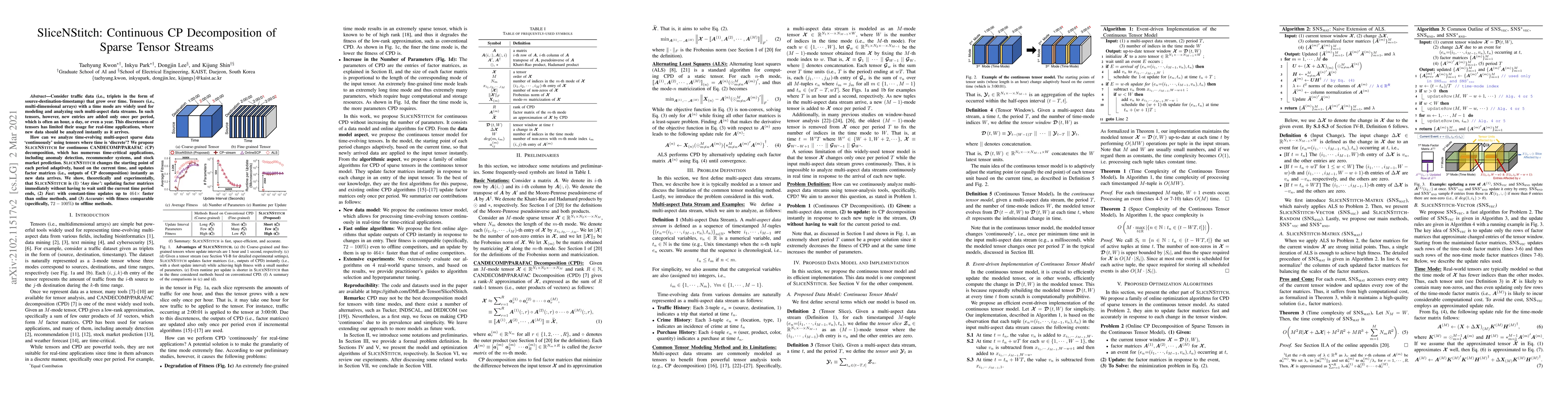 Researchers propose SLICENSTITCH for continuous CP decomposition of sparse tensor streams, enabling real-time analysis of time-evolving multi-aspect data with constant-time updates up to 464x faster than online methods.