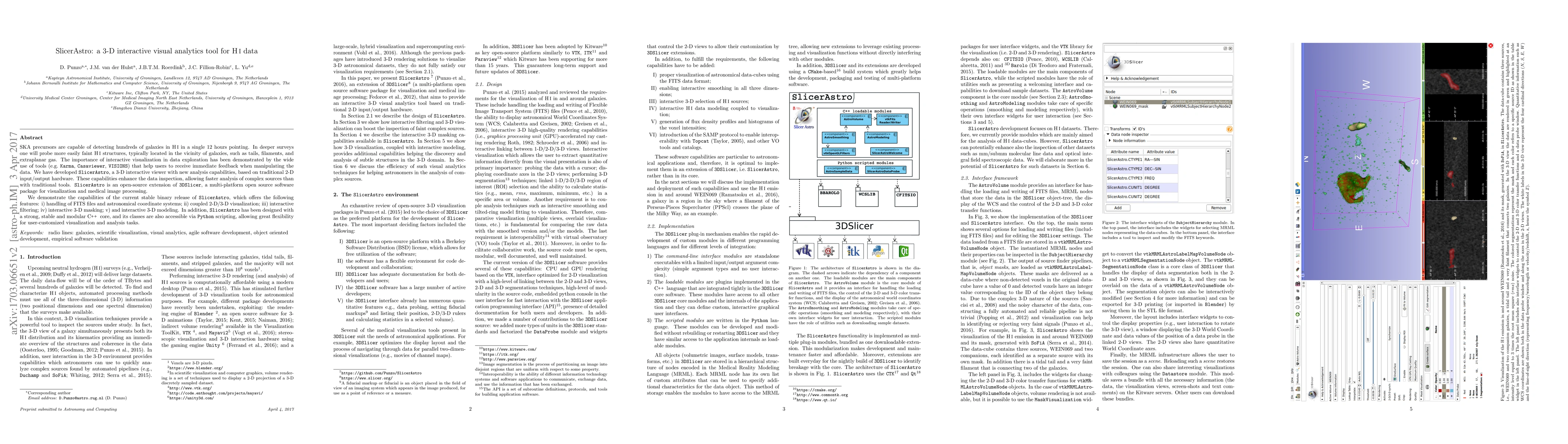 SlicerAstro is a 3-D interactive visual analytics tool designed for HI data exploration, offering advanced features like FITS file handling, coupled 2-D/3-D visualization, and interactive filtering. It enhances the analysis of complex astronomical structures through its modular C++ core and Python scripting capabilities.