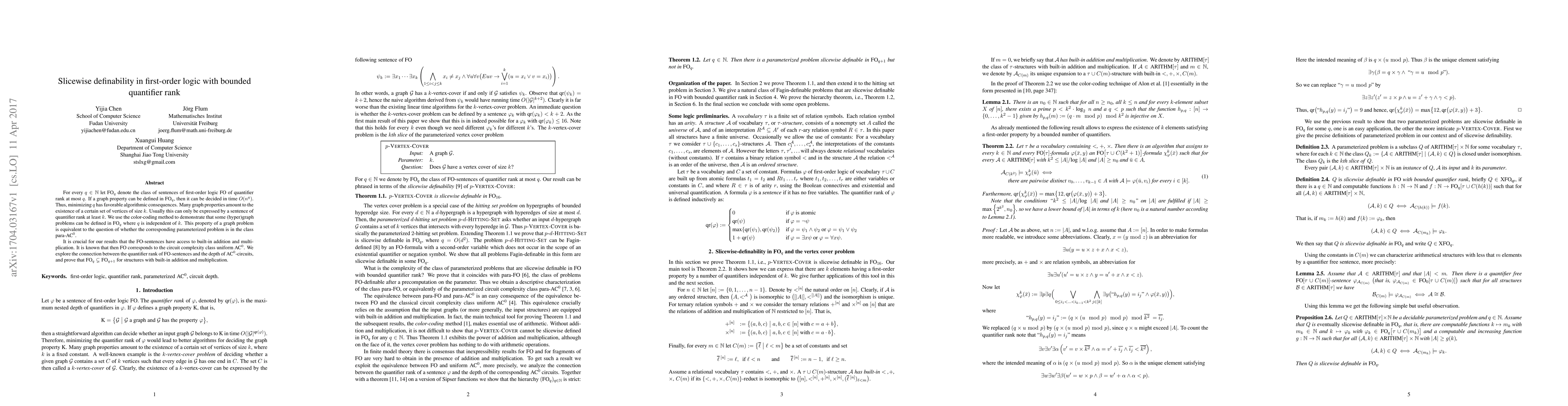 For every $q\in \mathbb N$ let $\textrm{FO}_q$ denote the class of sentences of first-order logic FO of quantifier rank at most $q$. If a graph property can be defined in $\textrm{FO}_q$, then it can be decided in time $O(n^q)$. Thus, minimizing $q$ has favorable algorithmic consequences. Many graph properties amount to the existence of a certain set of vertices of size $k$. Usually this can only be expressed by a sentence of quantifier rank at least $k$. We use the color-coding method to demonstrate that some (hyper)graph problems can be defined in $\textrm{FO}_q$ where $q$ is independent of $k$. This property of a graph problem is equivalent to the question of whether the corresponding parameterized problem is in the class $\textrm{para-AC}^0$. It is crucial for our results that the FO-sentences have access to built-in addition and multiplication. It is known that then FO corresponds to the circuit complexity class uniform $\textrm{AC}^0$. We explore the connection between the quantifier rank of FO-sentences and the depth of $\textrm{AC}^0$-circuits, and prove that $\textrm{FO}_q \subsetneq \textrm{FO}_{q+1}$ for structures with built-in addition and multiplication.