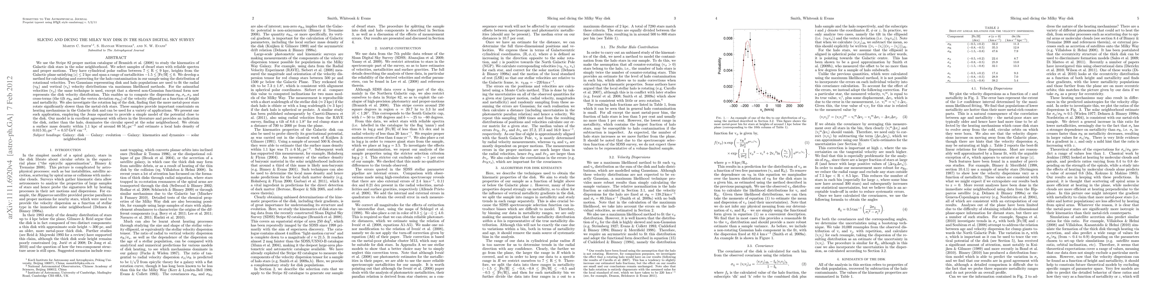 We use the Stripe 82 proper motion catalogue of Bramich et al. (2008) to study the kinematics of Galactic disk stars in the solar neighborhood. We select samples of dwarf stars with reliable spectra and proper motions. They have cylindrical polar radius between 7 < R < 9 kpc, heights from the Galactic plane satisfying z < 2 kpc and span a range of metallicities -1.5 < [Fe/H] < 0. We develop a method for calculating and correcting for the halo contamination in our sample using the distribution of rotational velocities. Two Gaussians representing disk and halo populations are used to fit the radial and vertical velocity distributions via maximum likelihood methods. For the azimuthal velocities the same technique is used, except that a skewed non-Gaussian functional form now represents the disk velocity distribution. This enables us to compute the dispersions and cross-terms (the tilt and the vertex deviation) of the velocity ellipsoid as a function of height and metallicity. We also investigate the rotation lag of the disk, finding that the more metal-poor stars rotate significantly slower than the metal-rich stars. These samples provide important constraints on heating mechanisms in the Galactic disk and can be used for a variety of applications. We present one such application, employing the Jeans equations to provide a simple model of the potential close to the disk. Our model is in excellent agreement with others in the literature and provides an indication the disk, rather than the halo, dominates the circular speed at the solar neighborhood. We obtain a surface mass density within 1.1 kpc of around 66 M/pc^2 and estimate a local halo density of 0.015 M/pc^3 = 0.57 GeV/cm^3.