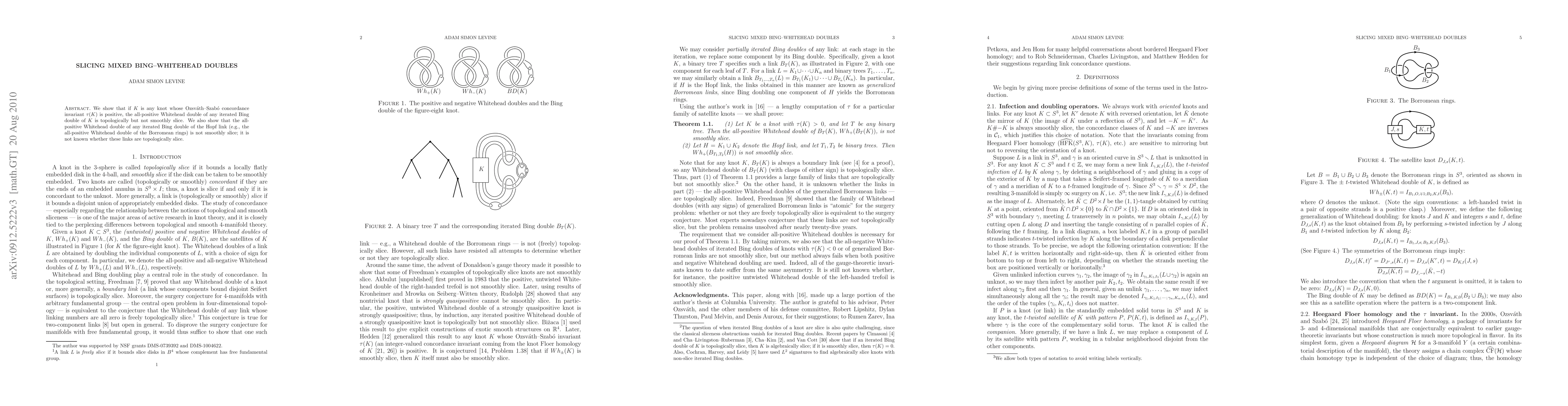 This paper demonstrates that certain knot and link constructions, specifically all-positive Whitehead doubles of iterated Bing doubles, are topologically slice but not smoothly slice. The findings apply to knots with positive Ozsvath-Szabo concordance invariants and to the Borromean rings.