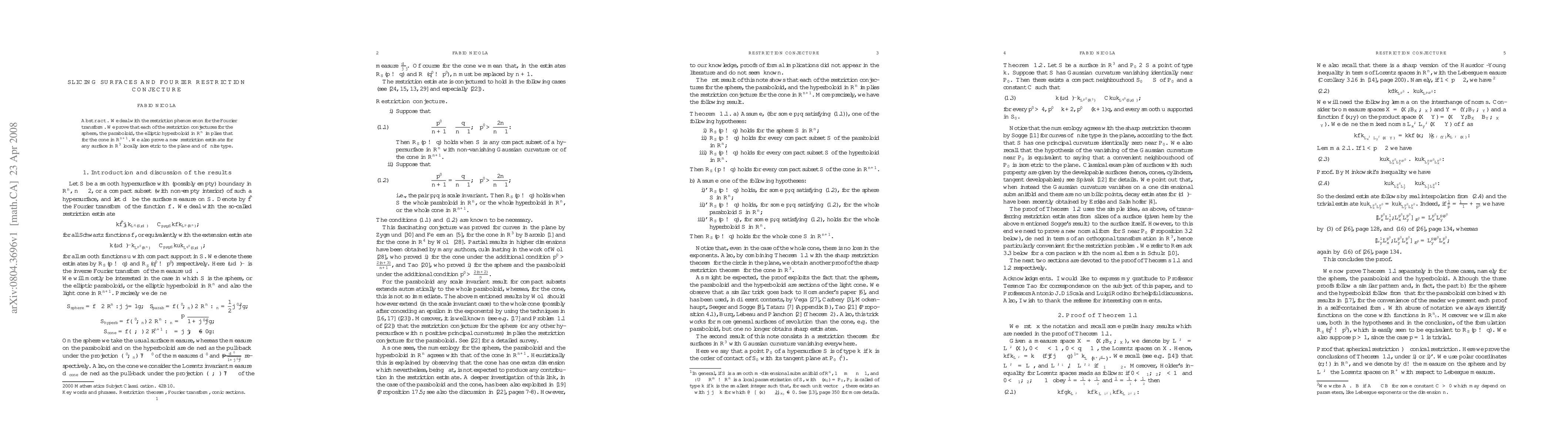 We deal with the restriction phenomenon for the Fourier transform. We prove that each of the restriction conjectures for the sphere, the paraboloid, the elliptic hyperboloid in $\mathbb{R}^n$ implies that for the cone in $\mathbb{R}^{n+1}$. We also prove a new restriction estimate for any surface in $\mathbb{R}^3$ locally isometric to the plane and of finite type.