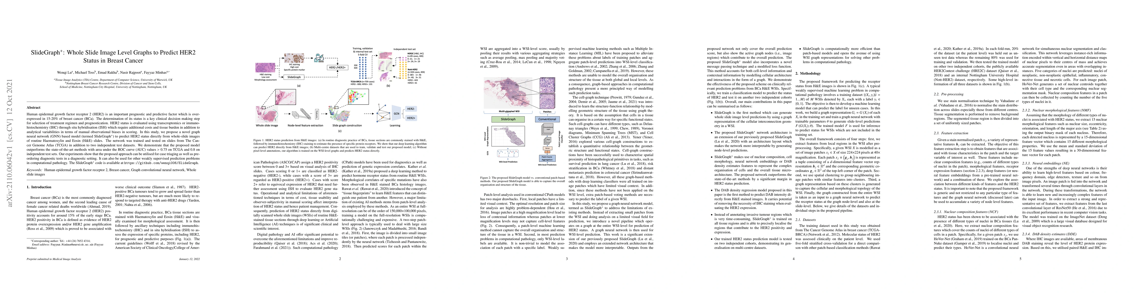 Human epidermal growth factor receptor 2 (HER2) is an important prognostic and predictive factor which is overexpressed in 15-20% of breast cancer (BCa). The determination of its status is a key clinical decision making step for selection of treatment regimen and prognostication. HER2 status is evaluated using transcroptomics or immunohistochemistry (IHC) through situ hybridisation (ISH) which require additional costs and tissue burden in addition to analytical variabilities in terms of manual observational biases in scoring. In this study, we propose a novel graph neural network (GNN) based model (termed SlideGraph+) to predict HER2 status directly from whole-slide images of routine Haematoxylin and Eosin (H&E) slides. The network was trained and tested on slides from The Cancer Genome Atlas (TCGA) in addition to two independent test datasets. We demonstrate that the proposed model outperforms the state-of-the-art methods with area under the ROC curve (AUC) values > 0.75 on TCGA and 0.8 on independent test sets. Our experiments show that the proposed approach can be utilised for case triaging as well as pre-ordering diagnostic tests in a diagnostic setting. It can also be used for other weakly supervised prediction problems in computational pathology. The SlideGraph+ code is available at https://github.com/wenqi006/SlideGraph.