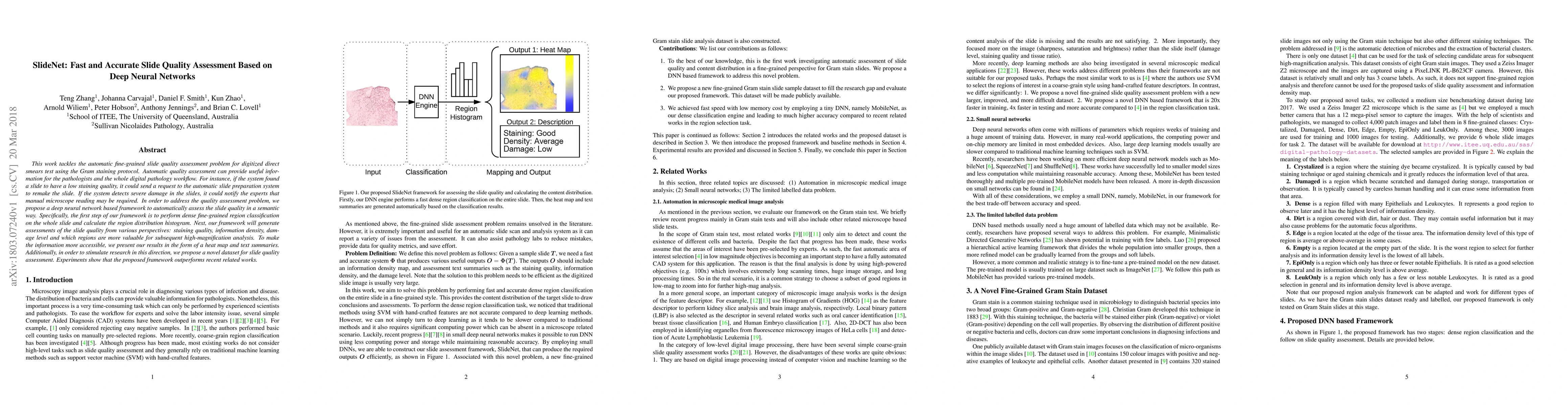 SlideNet employs deep neural networks to automatically assess the quality of digitized direct smear slides using the Gram staining protocol, providing actionable insights for pathologists and the digital pathology workflow. The framework evaluates staining quality, information density, and damage levels, and presents results via heat maps and text summaries, outperforming existing methods.