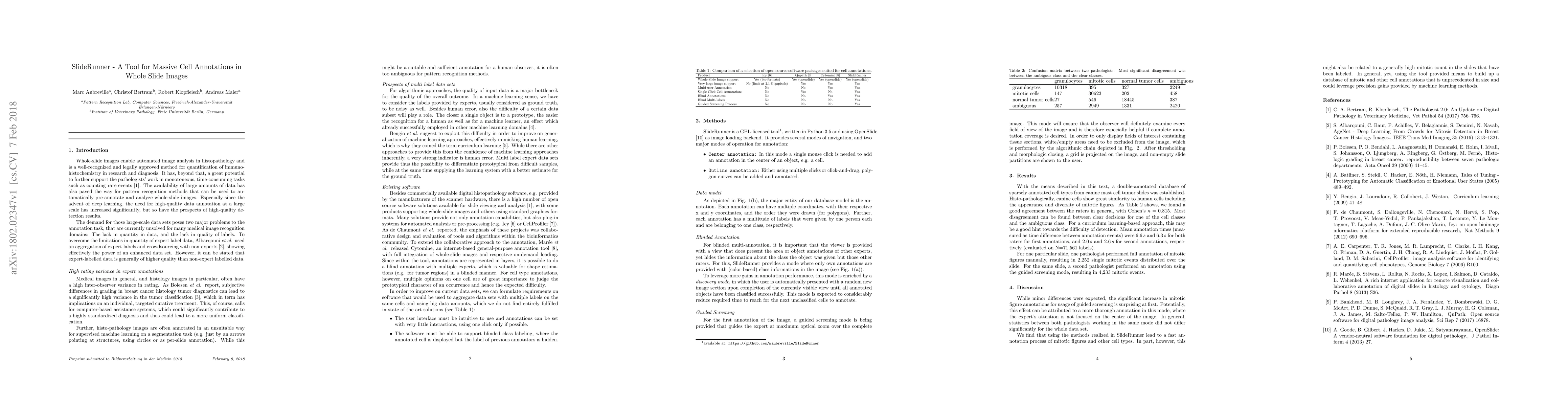 SlideRunner is an open-source annotation tool designed to facilitate rapid and accurate cell annotations in whole-slide histology images, particularly for mitosis detection. It supports both single-click annotations and a blind mode for multiple expert annotations, aiming to build large, reliable datasets.
