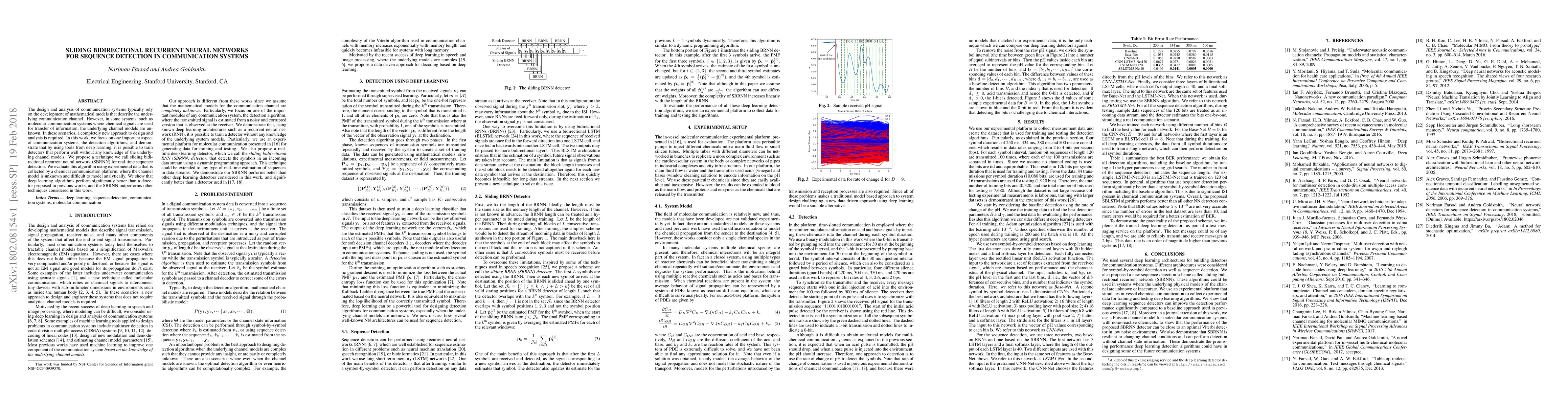 This paper proposes a sliding bidirectional recurrent neural network (SBRNN) for real-time sequence detection in communication systems, particularly in scenarios where the underlying channel model is unknown. Experimental results on a chemical communication platform demonstrate that the SBRNN outperforms traditional detectors and other deep learning techniques.
