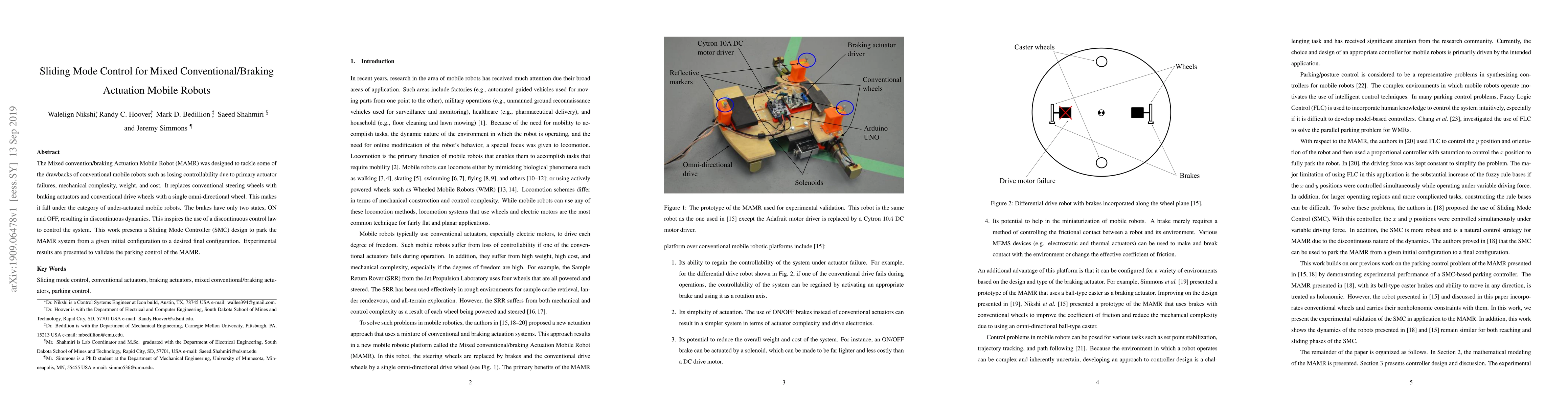The Mixed convention/braking Actuation Mobile Robot (MAMR) was designed to tackle some of the drawbacks of conventional mobile robots such as losing controllability due to primary actuator failures, mechanical complexity, weight, and cost. It replaces conventional steering wheels with braking actuators and conventional drive wheels with a single omni-directional wheel. This makes it fall under the category of under-actuated mobile robots. The brakes have only two states, ON and OFF, resulting in discontinuous dynamics. This inspires the use of a discontinuous control law to control the system. This work presents a Sliding Mode Controller (SMC) design to park the MAMR system from a given initial configuration to a desired final configuration. Experimental results are presented to validate the parking control of the MAMR.