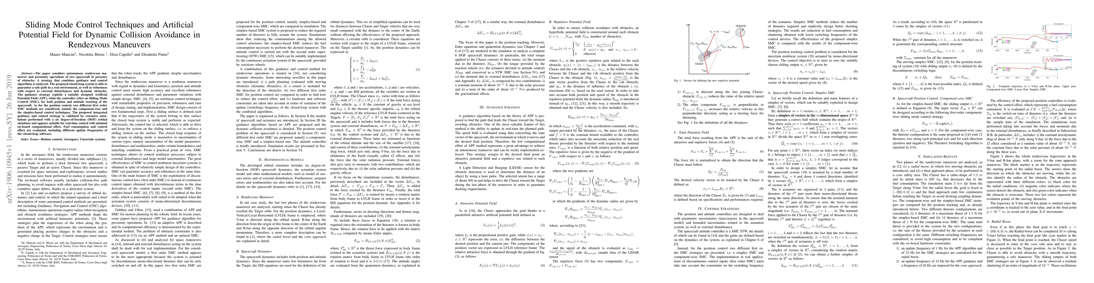 The paper considers autonomous rendezvous maneuver and proximity operations of two spacecraft in presence of obstacles. A strategy that combines guidance and control algorithms is analyzed. The proposed closed-loop system is able to guarantee a safe path in a real environment, as well as robustness with respect to external disturbances and dynamic obstacles. The guidance strategy exploits a suitably designed Artificial Potential Field (APF), while the controller relies on Sliding Mode Control (SMC), for both position and attitude tracking of the spacecraft. As for the position control, two different first order SMC methods are considered, namely the component-wise and the simplex-based control techniques. The proposed integrated guidance and control strategy is validated by extensive simulations performed with a six degree-of-freedom (DOF) orbital simulator and appears suitable for real-time control with minimal on-board computational effort. Fuel consumption and control effort are evaluated, including different update frequencies of the closed-loop software.