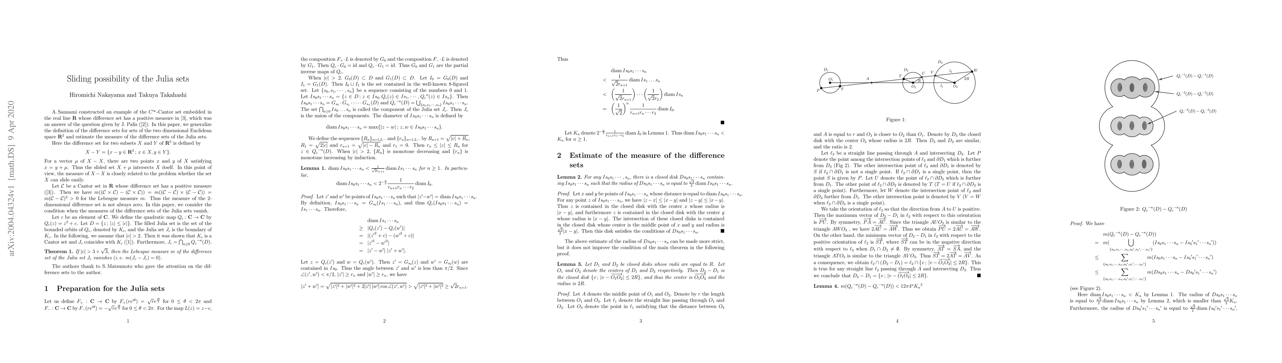A. Sannami constructed an example of the differentiable Cantor set embedded in the real line whose difference set has a positive measure. In this paper, we generalize the definition of the difference sets for sets of the two dimensional Euclidean space as the sets of vectors between two sets, and estimate their measures. For the quadratic map Q_c(z)=z^2+c, we obtain that the measure of the difference set of its Julia set vanishes if |c|>3+sqrt{3}.