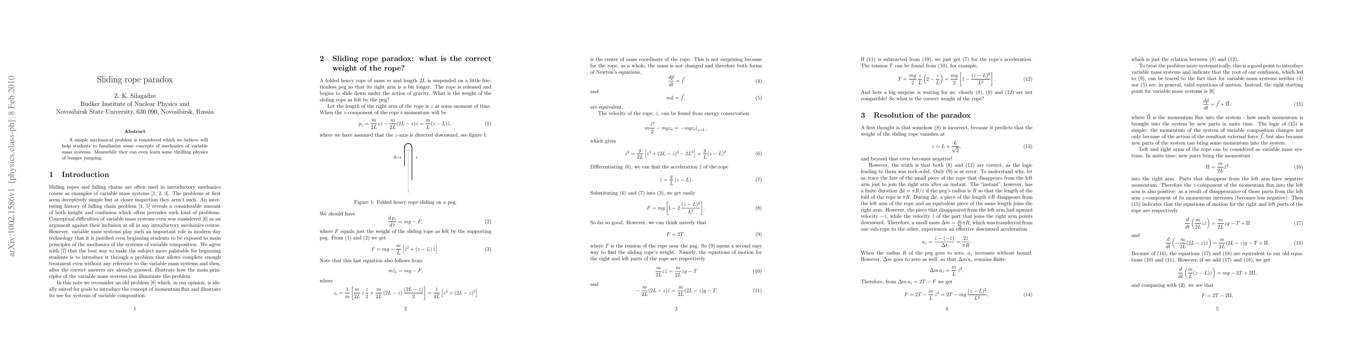 A research paper explores a mechanical problem involving a sliding rope paradox to illustrate concepts of variable mass systems in mechanics. It aims to help students understand physics through the thrilling example of bungee jumping.