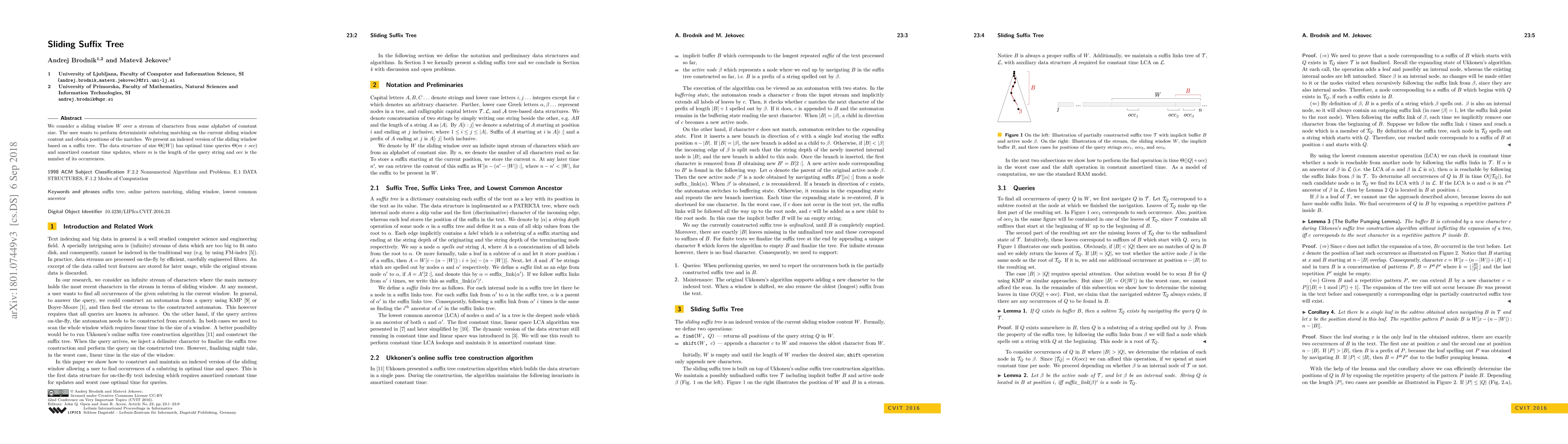 This paper proposes an efficient data structure for substring matching within a sliding window over a character stream, utilizing a sliding suffix tree with a link tree and lowest common ancestor (LCA) to achieve optimal query times and constant amortized update times. The structure maintains a size of $\Theta(|W|)$, where $|W|$ is the window size.