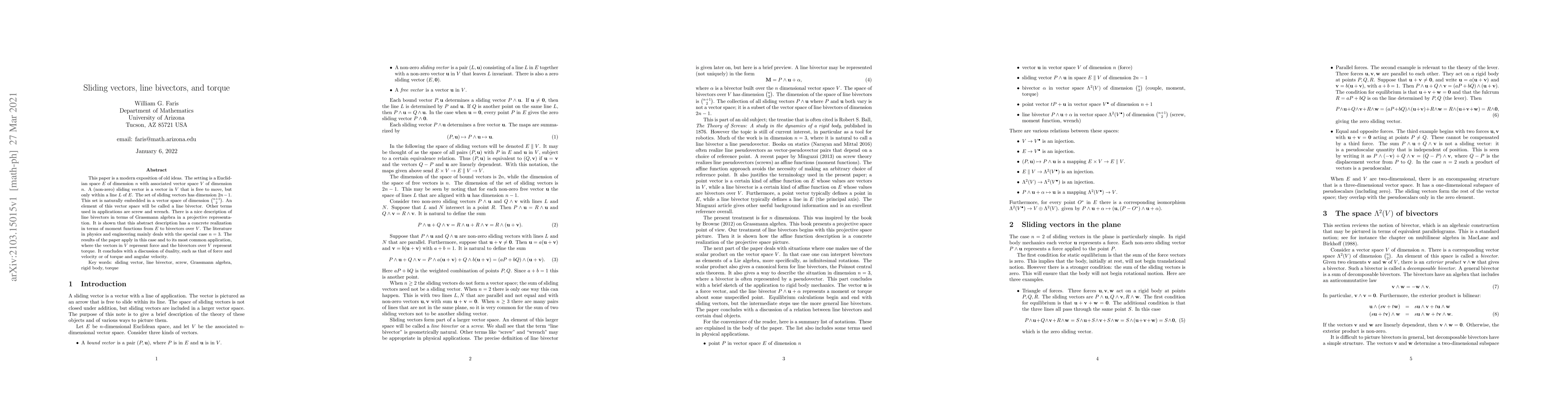 This paper is a modern exposition of old ideas. The setting is a Euclidian space $E$ of dimension $n$ with associated vector space $V$ of dimension $n$. A (non-zero) sliding vector is a vector in $V$ that is free to move, but only within a line $L$ of $E$. The set of sliding vectors has dimension $2n-1$. This set is naturally embedded in a vector space of dimension ${n +1 \choose 2}$. An element of this vector space will be called a line bivector. Other terms used in applications are screw and wrench. There is a nice description of line bivectors in terms of Grassmann algebra in a projective representation. It is shown that this abstract description has a concrete realization in terms of moment functions from $E$ to bivectors over $V$. The literature in physics and engineering mainly deals with the special case $n=3$. The results of the paper apply in this case and to its most common application, where the vectors in $V$ represent force and the bivectors over $V$ represent torque. It concludes with a discussion of duality, such as that of force and velocity or of torque and angular velocity.