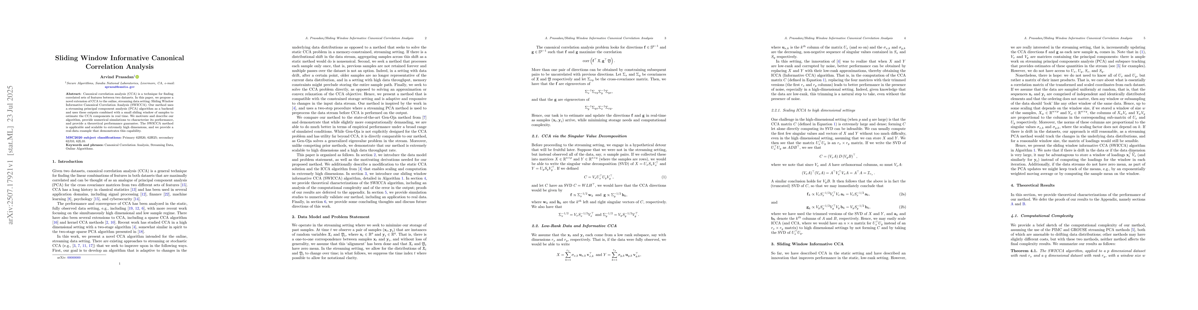 Canonical correlation analysis (CCA) is a technique for finding correlated sets of features between two datasets. In this paper, we propose a novel extension of CCA to the online, streaming data setting: Sliding Window Informative Canonical Correlation Analysis (SWICCA). Our method uses a streaming principal component analysis (PCA) algorithm as a backend and uses these outputs combined with a small sliding window of samples to estimate the CCA components in real time. We motivate and describe our algorithm, provide numerical simulations to characterize its performance, and provide a theoretical performance guarantee. The SWICCA method is applicable and scalable to extremely high dimensions, and we provide a real-data example that demonstrates this capability.