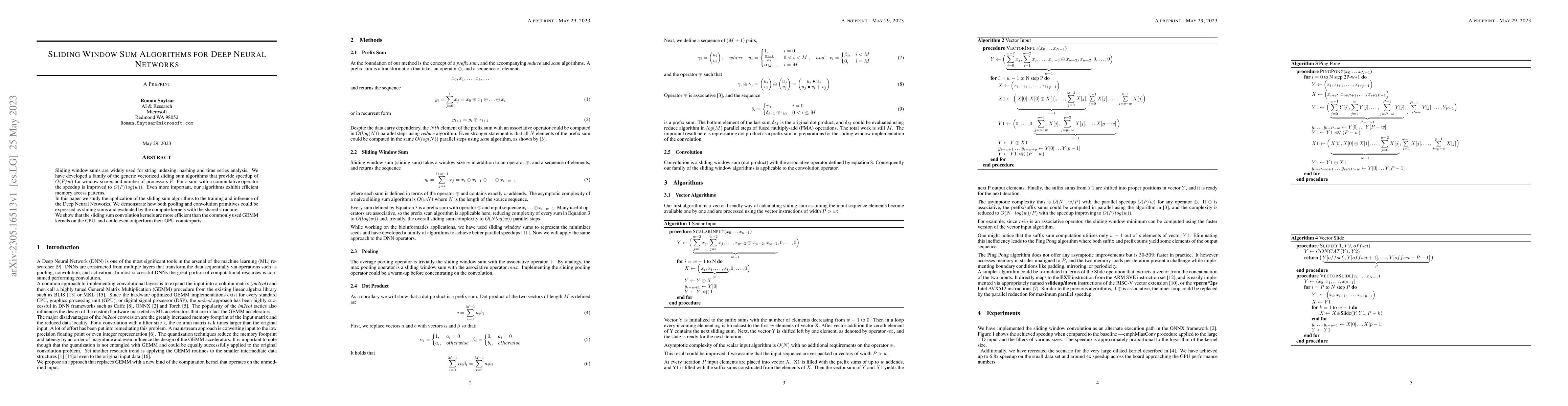 This paper introduces vectorized sliding sum algorithms that achieve significant speedup and efficient memory access patterns, applicable to deep neural network training and inference. The algorithms outperform traditional GEMM kernels in both CPU and GPU implementations by expressing pooling and convolution as sliding sums.