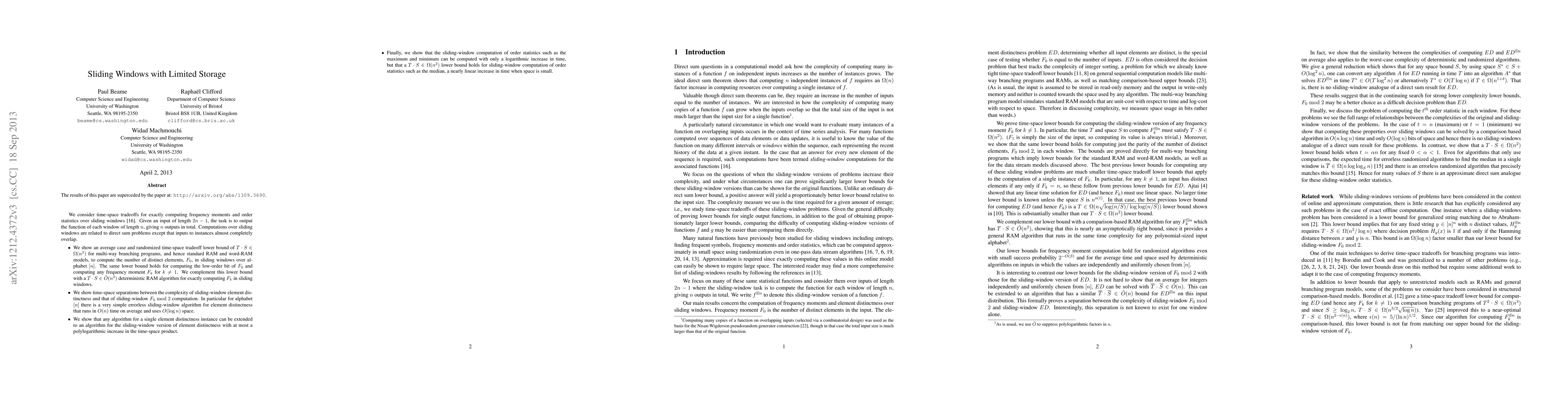 The paper analyzes time-space tradeoffs for computing frequency moments and order statistics over sliding windows using both average-case and randomized lower bounds, complemented by deterministic algorithms.