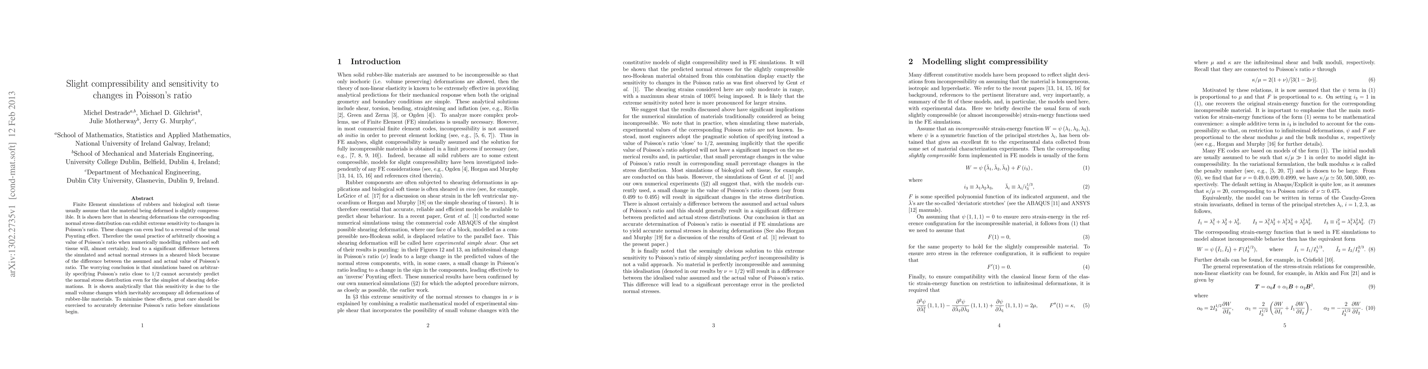 This paper highlights that shearing deformations in rubbers and biological soft tissue can be highly sensitive to changes in Poisson's ratio, potentially reversing typical stress distributions. Accurately determining Poisson's ratio is crucial for reliable finite element simulations to avoid significant discrepancies in predicted normal stresses.