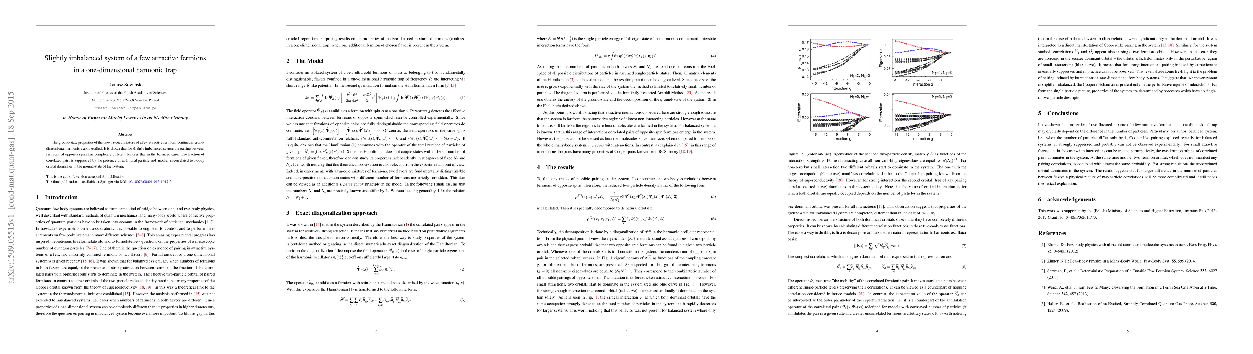 The ground-state properties of the two-flavored mixture of a few attractive fermions confined in a one-dimensional harmonic trap is studied. It is shown that for slightly imbalanced system the pairing between fermions of opposite spins has completely different features that in the balanced case. The fraction of correlated pairs is suppressed by the presence of additional particle and another uncorrelated two-body orbital dominates in the ground-state of the system.