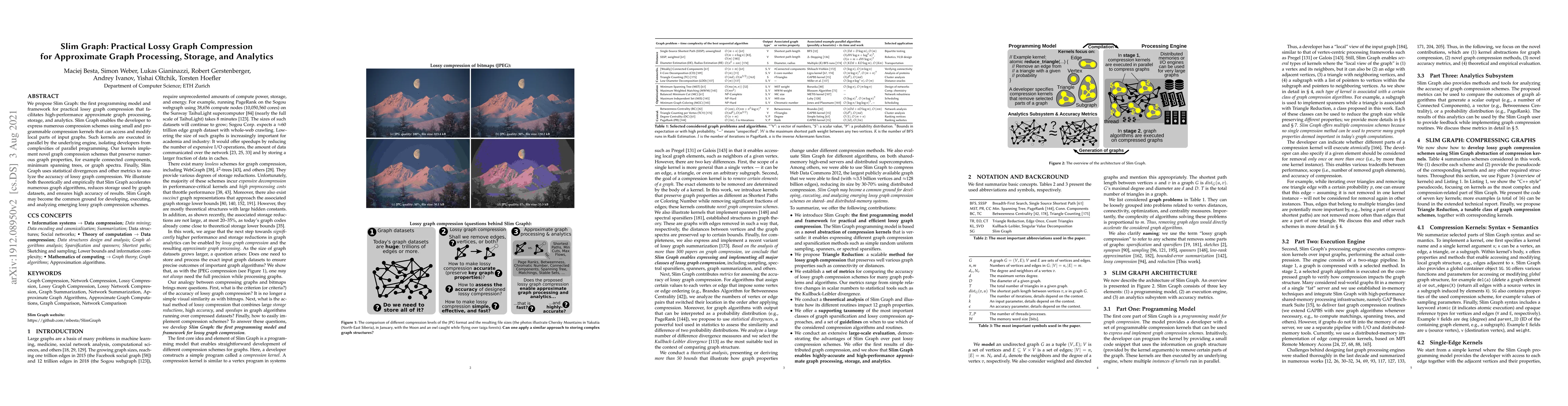 Slim Graph is a novel framework for lossy graph compression that enables high-performance approximate graph processing and analytics. It provides programmable compression kernels that simplify complex parallel programming and preserves essential graph properties, while statistically analyzing compression accuracy.