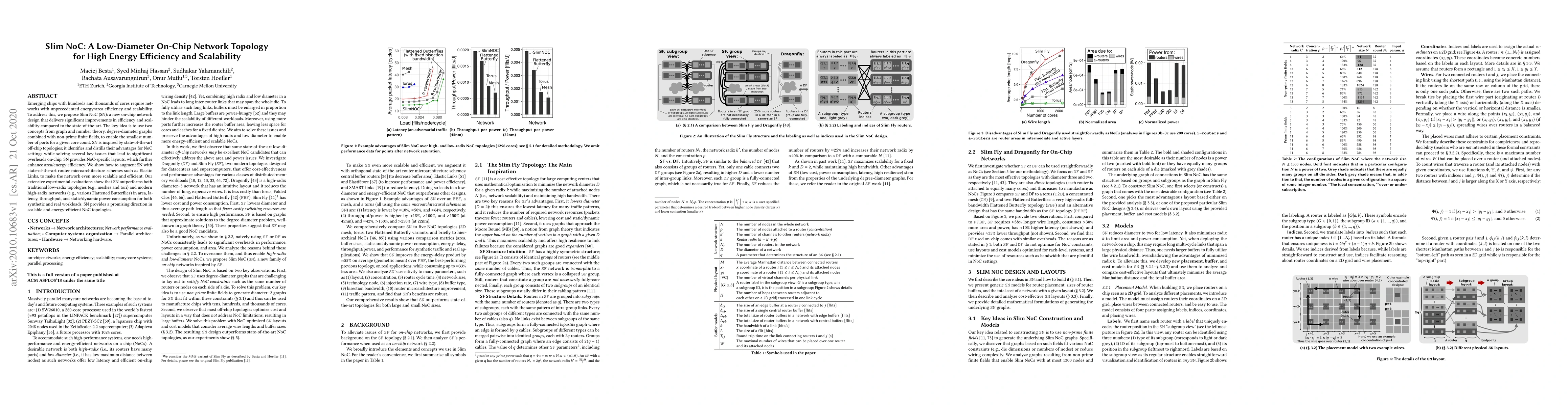 Slim NoC (SN) proposes a novel on-chip network design that significantly enhances energy efficiency and scalability for multi-core chips. By combining degree-diameter graphs with non-prime finite fields, SN achieves minimal network diameter and port count, outperforming traditional and modern high-radix topologies in various metrics.
